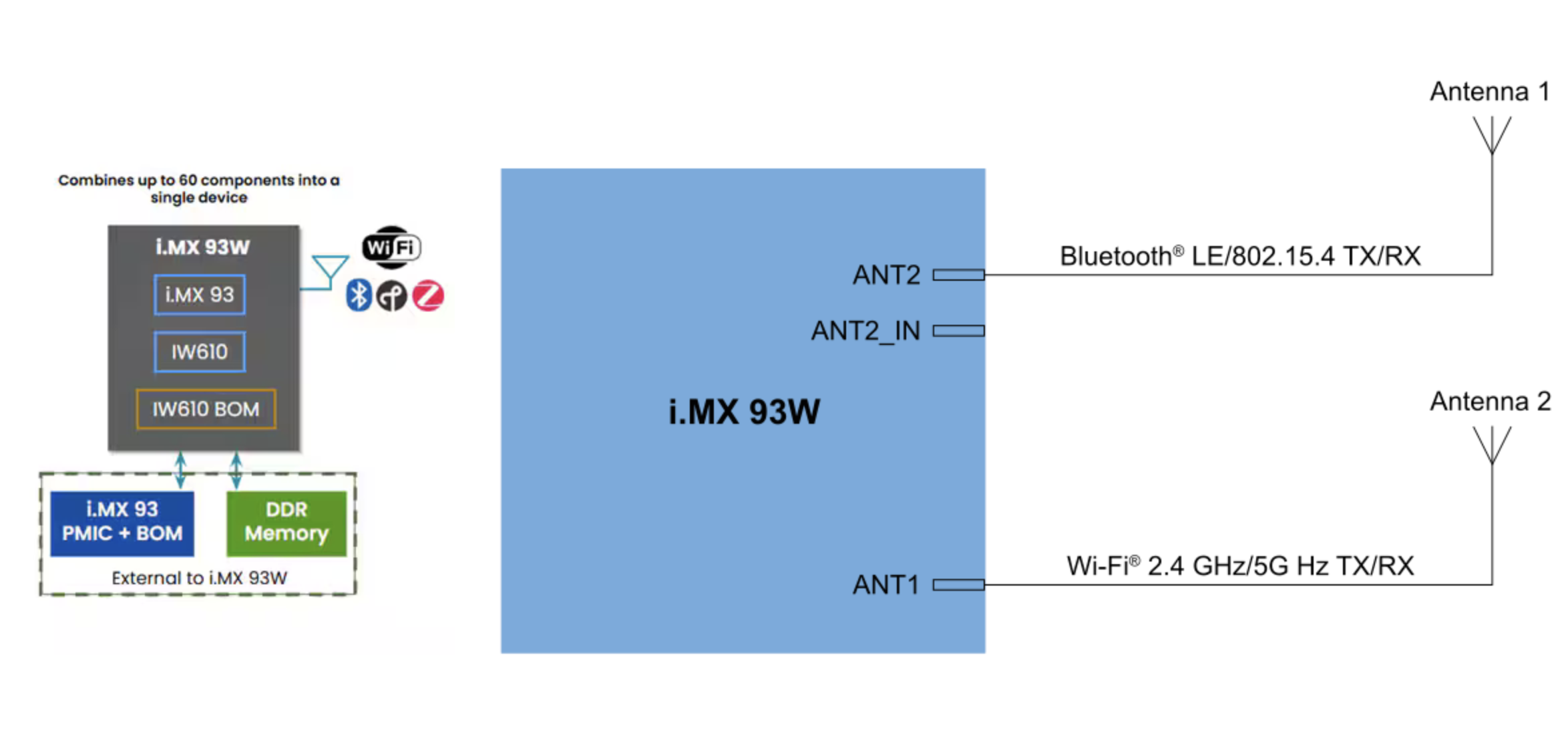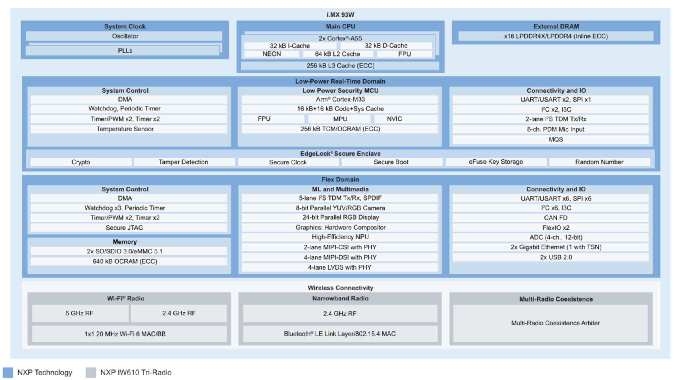 D’un point de vue technique, ce circuit s’appuie sur un double cœur Arm Cortex-A55 cadencés à 1,7 GHz, un coeur Arm Cortex-M33 pour le temps réel, une unité neuronale ou NPU (Neural Processing Unit) Ethos d’Arm délivrant une puissance de calcul de 1,8 Tops et le bloc radio IW610 issu de NXP.