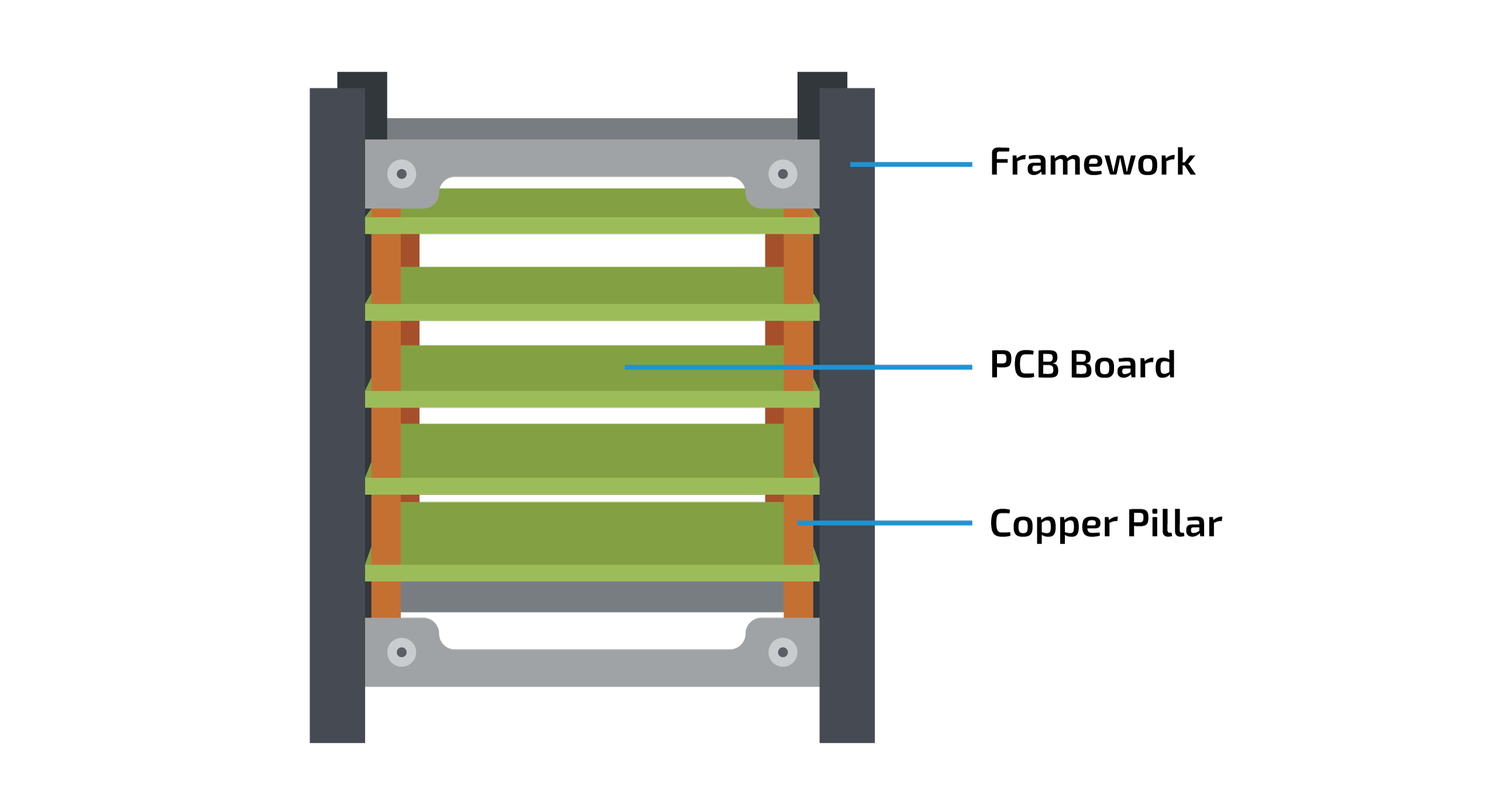 Dans un système à compression, les éléments de contact sont placés entre des patins d’accouplement sur des surfaces opposées. La continuité électrique est assurée lorsqu'une force de compression définie est appliquée sur l'empilement. Aucune terminaison soudée n'est requise et il n'y a pas de broches rigides reliant les cartes.