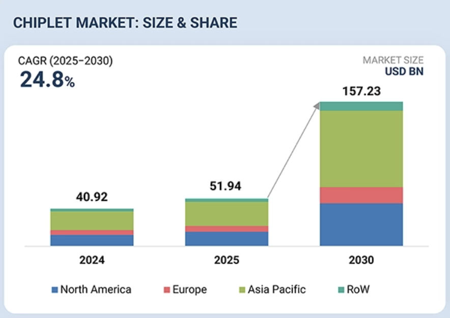 Selon les chiffres du rapport "Marché des chiplets par processeur (FPGA, CPU, GPU, SoC, coprocesseur ASIC IA) et technologie d'encapsulation (SiP, FCCSP, FCBGA, 2.5D/3D, WLCSP, Fan-Out) - Prévisions mondiales jusqu'en 2030 " publié par la société d’analyse économique Marketsandmarkets, le marché des chiplets devrait passer de 51,94 milliard de dollars en 2025 à 157,23 milliards en 2030, soit un un taux moyen annuel de croissance de 24,8 % sur la période de prévision.