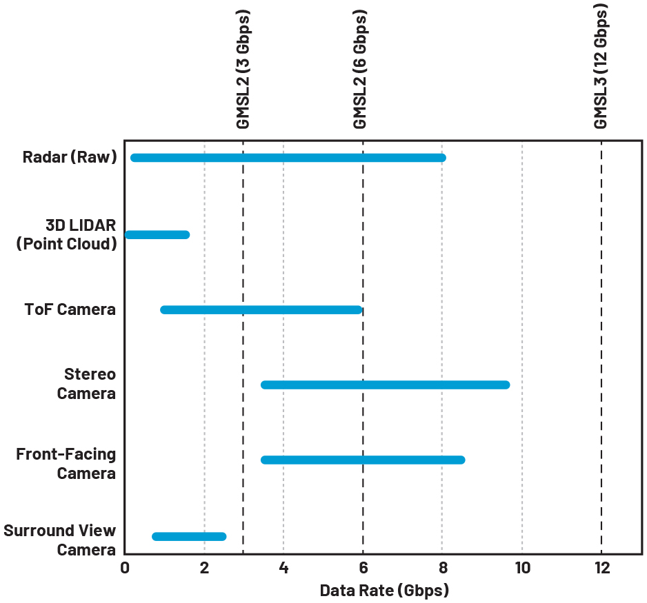 Ce débit de données convient également pour les capteurs ToF avec sortie raw, ou les systèmes de vision stéréo qui transmettent les sorties raw de deux capteurs d’images ou envoient un flux de nuages de points traités provenant d’un processeur de signal d'image intégré.