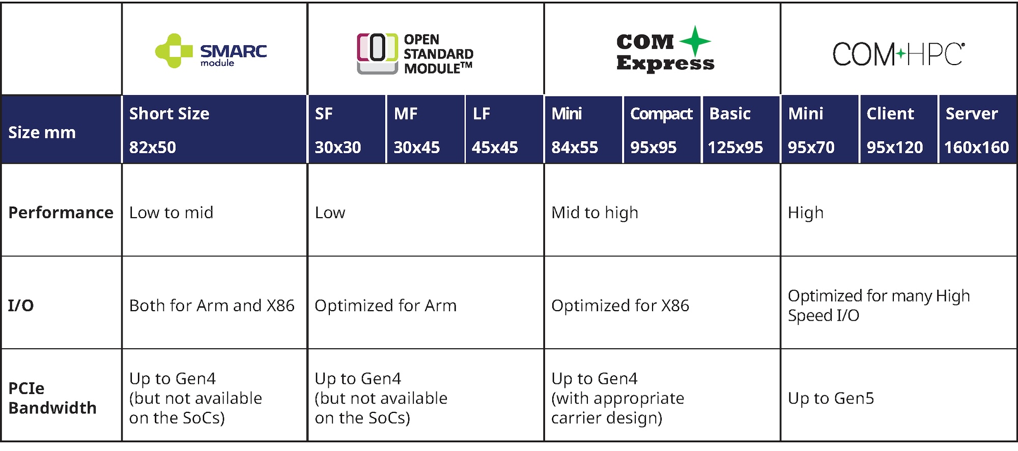 Au-delà, les COM Express et les autres standards COM ont adopté l’architecture Arm plus récemment, ce qui ouvre de nouvelles possibilités de développement en termes d’architecture. Les formats matériels optimisés pour gérer des tailles compactes connaissent eux aussi un développement rapide.