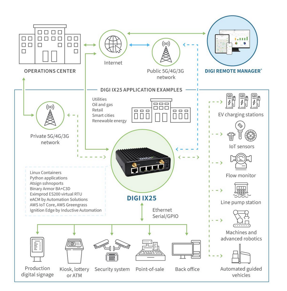 L’informatique intégrée dans le IX25 avec notamment la technologie des conteneurs de Digi autorise un déploiement rapide d'applications personnalisées directement sur l'appareil, réduisant ainsi la latence et la dépendance vis-à-vis du cloud.