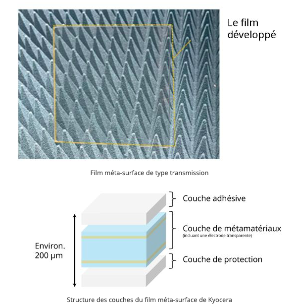 Dans le détail, grâce à la structure d'éléments brevetée de Kyocera, le film conserve des propriétés de réfraction des ondes radio, comparables à celles des plaques de métasurface conventionnelles, tout en présentant un facteur de forme de film flexible. Il se compose de trois couches : une couche adhésive, une couche de métamatériaux ainsi qu'une couche de protection, d'une épaisseur globale d'environ 200 μm.