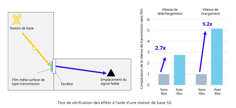 Kyocera a effectué des tests dans un environnement 5G à ondes millimétriques en intérieur en vue d'évaluer l'efficacité du film métasurface. Lors de ces essais, un appareil mobile a été placé dans une zone où la couverture du signal de la station de base était faible, entraînant une faible réception du signal. Lorsque la méta-surface a été appliqué sur la vitre d'une fenêtre, la vitesse de transmission s'est considérablement améliorée, les vitesses de téléchargement pouvant être multipliées par 2,7 et les vitesses de téléversement par 5,2.