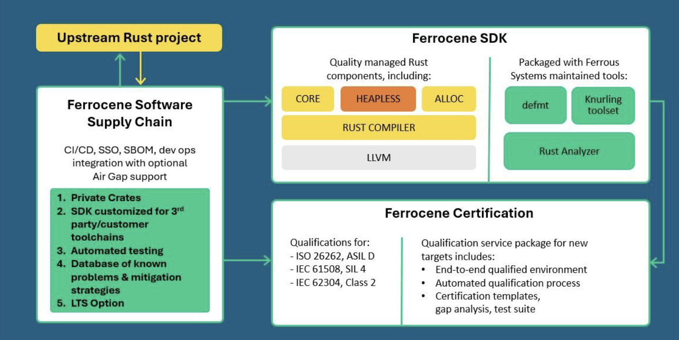 A ce niveau, on notera que pour lever les freins de l’utilisation de Rust dans les environnements critiques, Ferous collabore notamment avec le français TrustInSoft, autour de l'analyse, du débogage et du déploiement multilangage d’un code Rust.