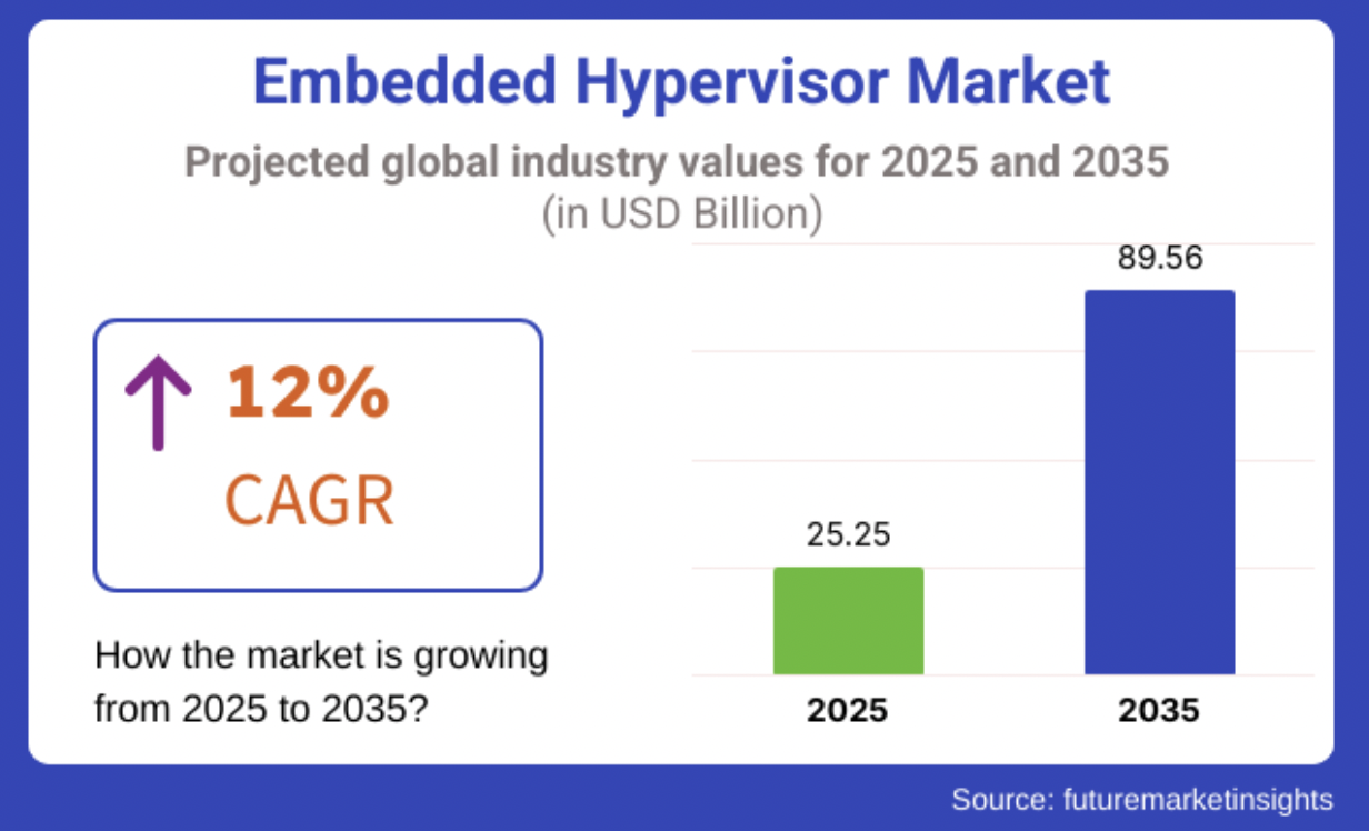 Ainsi, selon cette étude, ce marché des hyperviseurs embarqués devrait passer de 25,25 milliards de dollars en 2025 à 89,56 milliards de dollars en 2035, soit un taux de croissance annuel moyen de 12% sur cette période.