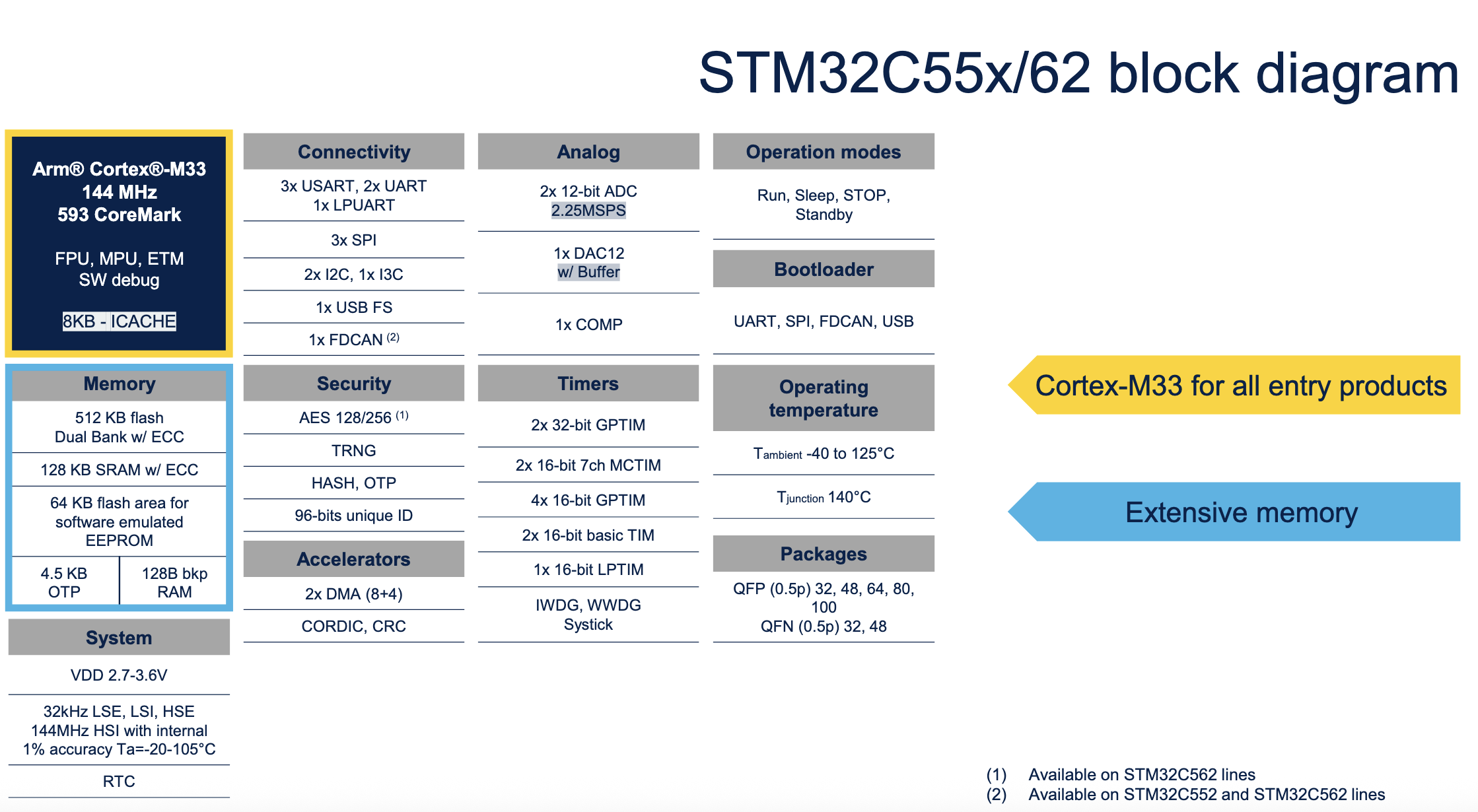 Conçus pour des environnements industriels exigeants, les STM32C4 fonctionne en gamme de température étendue, - 40 °C à 125 °C, avec une température de jonction pouvant atteindre 140 °C.