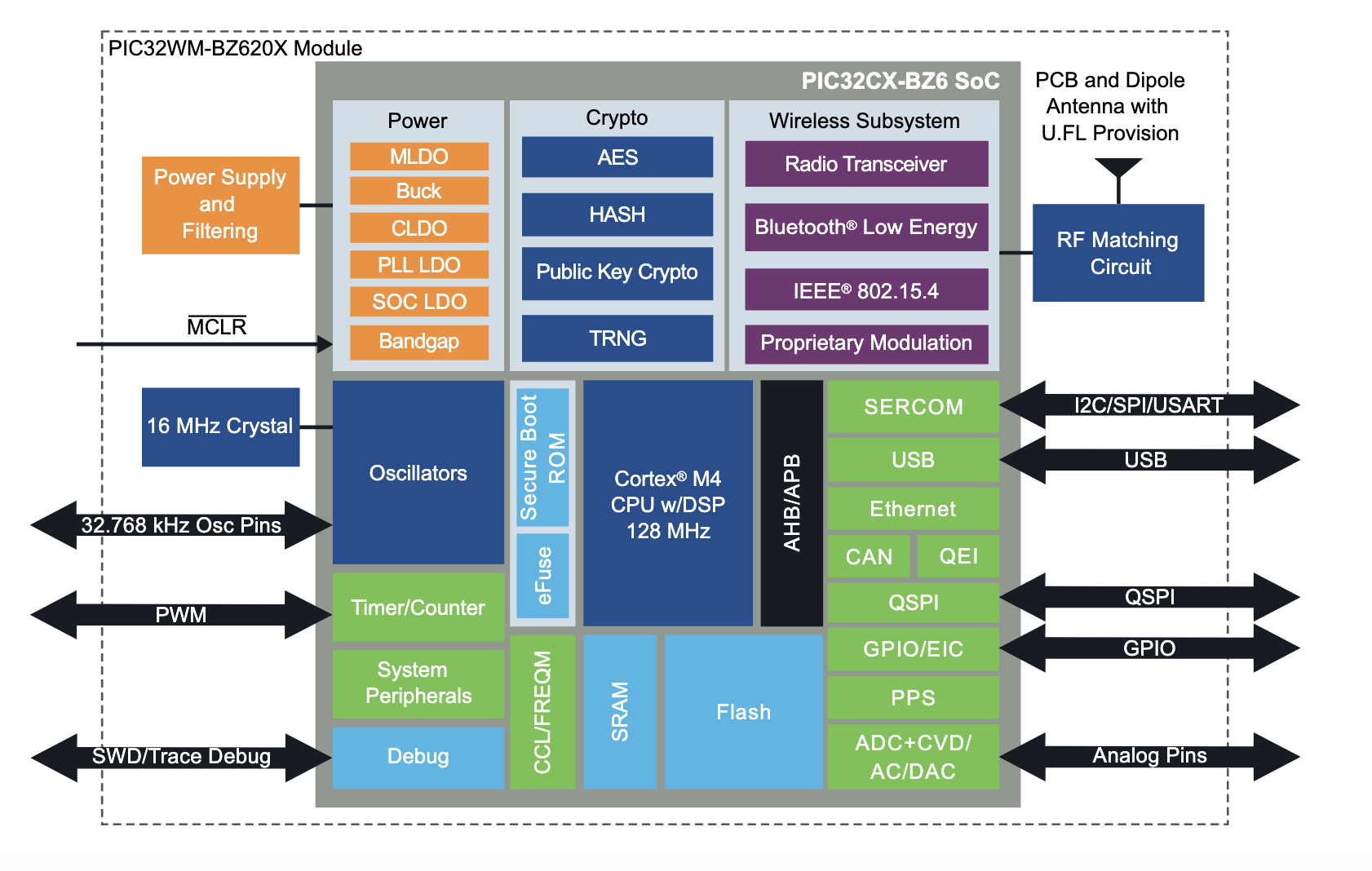 Dans le détail, le microcontrôleur PIC32-BZ6 est doté d’un coeur 32 bits Arm Cortex-M4F à 128 MHz flanqué de 2 Mo de mémoire flash et de 512 Ko de Ram, avec la particularité d’être disponible soit sous forme d'un circuit soit d'un module à 132 broches pour une intégration plus rapide (shema ci-dessous).