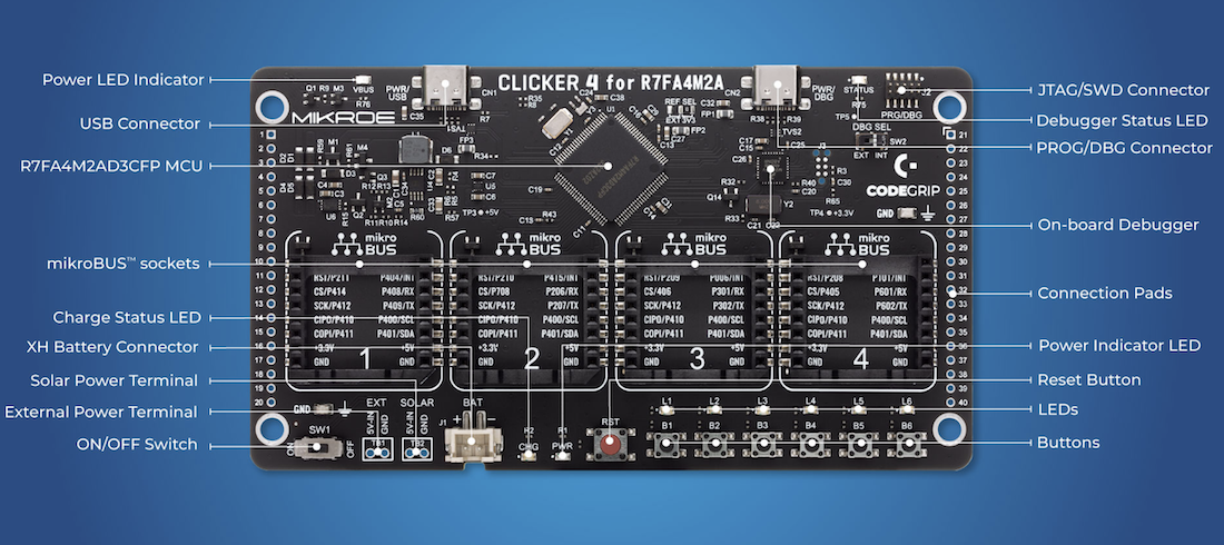 La fonction Codegrip de MikroE intégrée permet en outre la programmation et le débogage à travers un port USB-C, facilitant le chargement du firmware et le débogage en temps réel sans recours à un matériel externe.