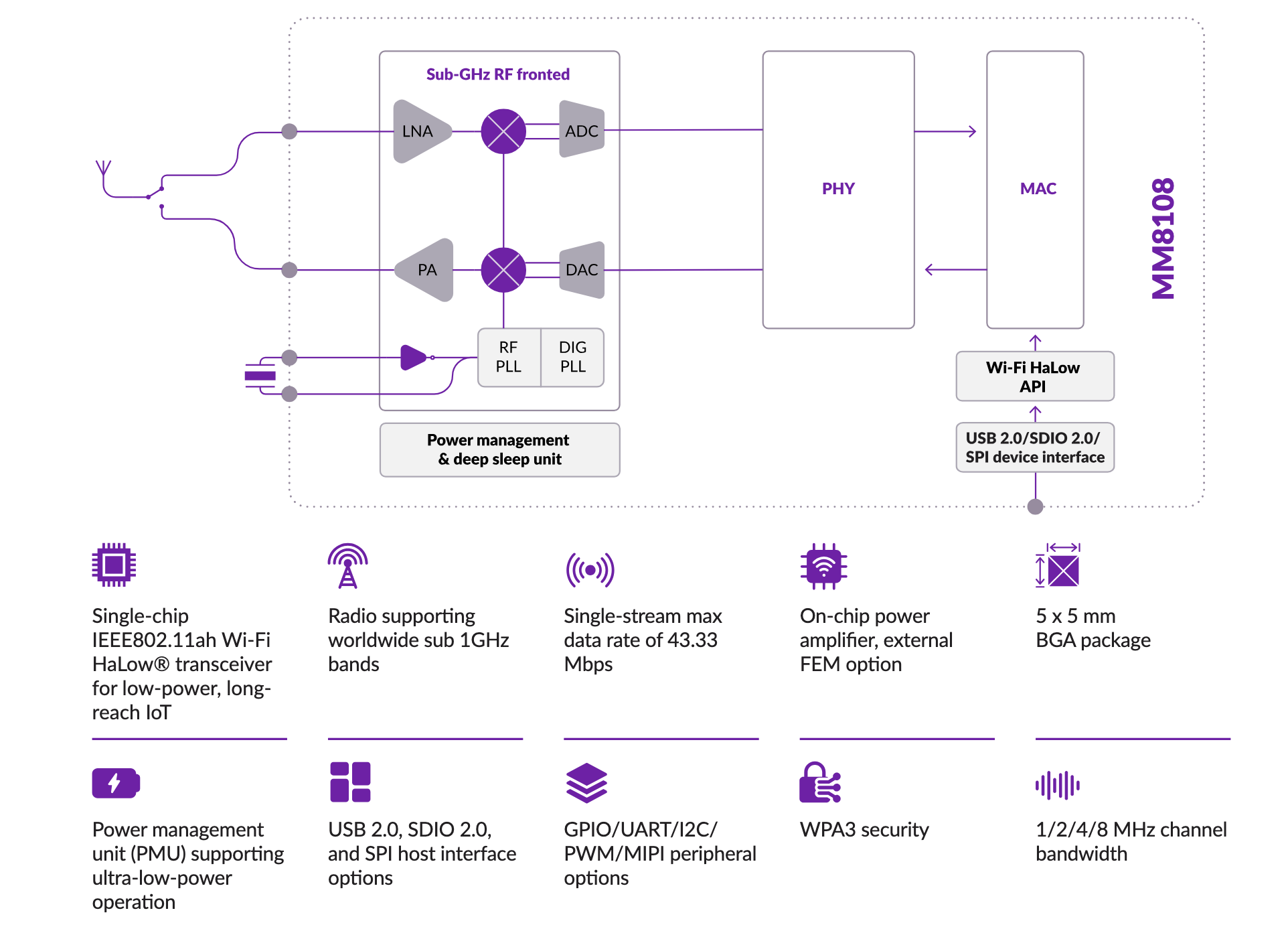 La puce-système MM8108 qui procure une connexion Wi-Fi longue portée à des vitesses pouvant atteindre 43 Mega opérations/s - grâce à un taux de modulation 256 QAM et un amplificateur de puissance interne de 26 dBm - est désormais disponible à travers la carte d’évaluation MM8108-EKH01, intégrant le circuit BCM2711 de Broadcom sur une plateforme Raspberry Pi 4 sous Linux, ou alors par la biais de la carte MM8108-EKH05 intégrant le STM32U585 de ST Microelectronics sous le système d’exploitation en open source FreeRTOS ou encore le système MM8108-EKH19 qui est une clé USB-A avec le routeur GL-MT3000 de Gli.net et la puce-systèmes Wi-Fi 6 MT7981B de MediaTek.