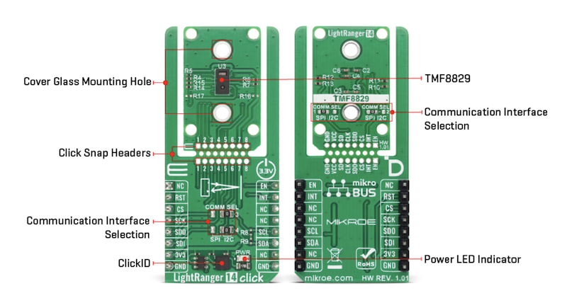 La LightRanger 14 Click procure des interfaces I²C (compatible I3C) et SPI, ainsi que des broches dédiées à la signalisation de contrôle et d'interruption. Compatible avec l’interface standardisée mikroBUS, elle peut être utilisée avec tout système hôte prenant en charge cette spécification, répandue sur les plateformes d'évaluation de microcontrôleurs et de processeurs.