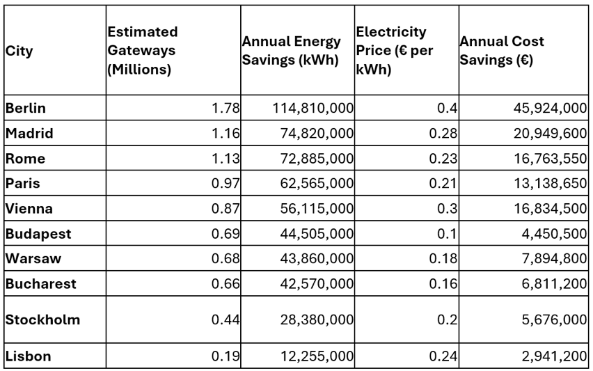 Le tableau illustre l’impact de la consommation de box internet dans plusieurs grandes agglomérations de l’Union européenne, en mettant en perspective les économies potentielles d’énergie, de CO₂ et de dépenses, si chaque foyer adoptait une passerelle IoT basse consommation pilotée par les objets du domicile.