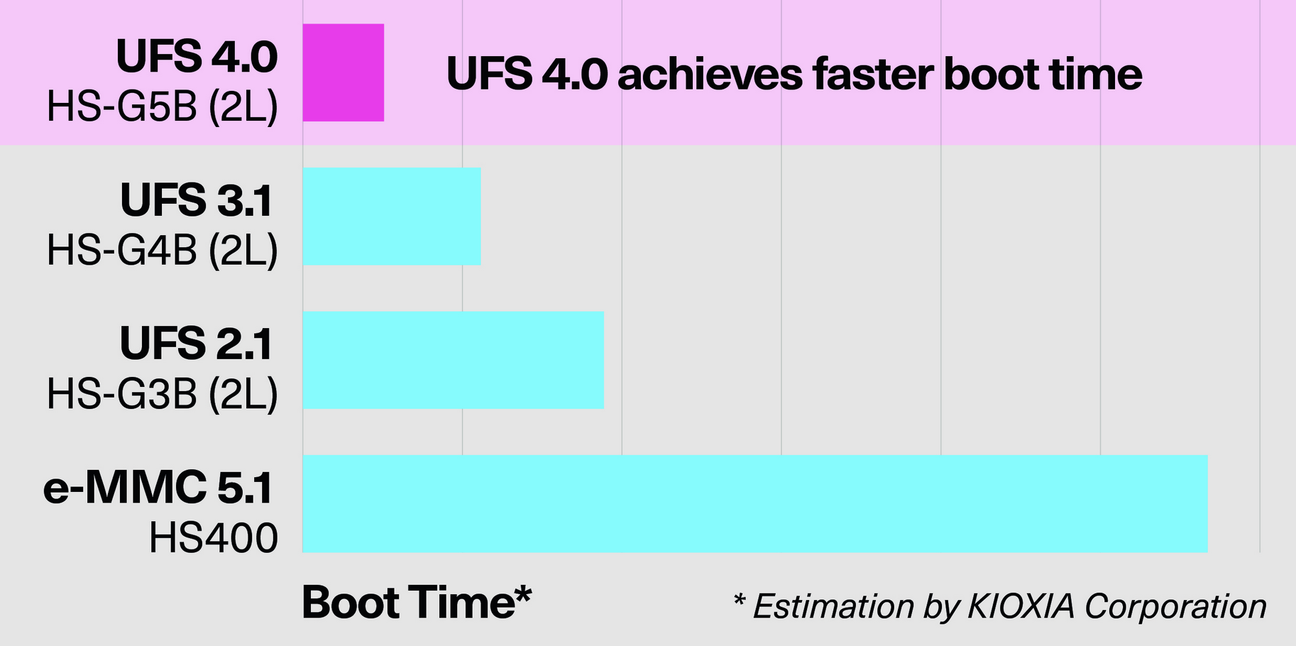 L’UFS 4.0 offre un temps de démarrage considérablement plus court par rapport à l’e-MMC et à l’UFS 2.1/3.1 (source : KIOXIA)
