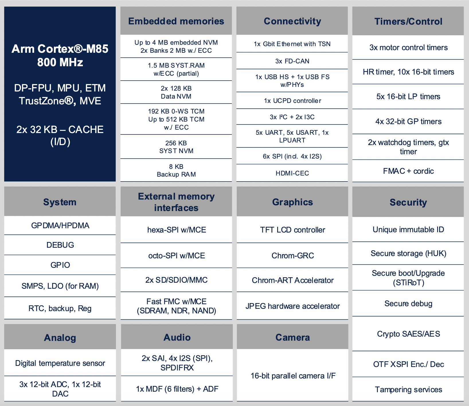 Des interfaces numériques - bus FD-CAN, xSPI, I2C, UART/USART, USB - des périphériques analogiques et des sources d’horloge complètent l’ensemble.
