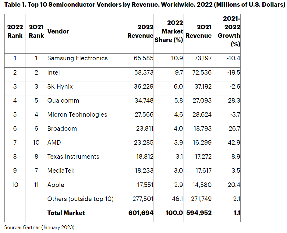 L’Europe brille par son absence dans le top 10 du marché des semi-conducteurs 2022Avec un chiffre d’affaires en recul de 10,4%, lié au déclin de ses ventes de mémoires et plus particulièrement de mémoires flash Nand, Samsung a maintenu en 2022 sa place en tête du marché des semi-conducteurs devant Intel, qui, lui, a vu son CA régresser de 19,5% en raison principalement de la baisse significative du marché des PC grand public et d’une concurrence acharnée sur le créneau des processeurs x86. Tel est le constat de la société d’études Gartner qui, selon des résultats préliminaires, estime à 1,1% la progression des ventes de semi-conducteurs en 2022, à hauteur de 601,7 milliards de dollars (contre 583,5 milliards de dollars en 2021). Le chiffre d’affaires combiné des 25 principaux fournisseurs de semi-conducteurs a, quant à lui, augmenté de 2,8% l’an passé et représentait 77,5% du marché total. « 2022 a démarré alors que la pénurie frappait de nombreux types de semi-conducteurs, entraînant un allongement des délais de livraison et une augmentation des prix et, partant, une baisse de la production d'équipements électroniques dans de nombreux secteurs, rappelle Andrew Norwood, vice-président de Gartner. En conséquence, les équipementiers ont commencé à se protéger des pénuries en stockant des puces. Par ailleurs, au second semestre 2022, l'économie mondiale a commencé de ralentir sous la pression d'une inflation élevée, de la hausse des taux d'intérêt et des coûts de l'énergie, et des confinements en Chine, liés à la pandémie de Covid-19. Ce qui a impacté les chaînes d'approvisionnement mondiales. Les consommateurs ont également commencé à réduire leurs dépenses, notamment en matière de micro-ordinateurs et de smartphones, puis les entreprises ont fait de même en prévision d'une récession mondiale, ce qui a eu un impact sur la croissance globale des semi-conducteurs. » Les mémoires, qui ont compté pour environ 25% des ventes de semi-conducteurs en 2022, se sont avérées la catégorie de semi-conducteurs la moins performante l’an passé, avec une baisse de 10% des ventes. Mi-2022, le marché des mémoires montrait déjà des signes d'effondrement significatif de la demande alors que les équipementiers commençaient à vider les stocks de mémoires qu'ils détenaient en prévision d'une demande plus forte. Selon Gartner, les conditions se sont aujourd’hui détériorées au point que la plupart des sociétés présentes sur la marché des mémoires ont annoncé des réductions des dépenses d’investissement pour 2023, et certaines ont réduit la production de plaquettes de silicium pour réduire le niveaux des stocks et tenter de rééquilibrer les marchés. Les revenus globaux non liés aux mémoires ont, quant à eux, augmenté de 5,3% en 2022, mais les performances ont énormément varié selon les catégories de semi-conducteurs, note Gartner. La plus forte croissance est venue de l'analogique avec une augmentation de 19%, suivie de près par les composants discrets, en hausse de 15% par rapport à 2021. La croissance de l'analogique et des discrets a été tirée par une forte demande des marchés de l'automobile et de l'industriel, soutenue par des évolutions de longue haleine comme l'électrification des véhicules, automatisation industrielle et la transition énergétique. On notera enfin que, comme en 2021, aucune société européenne ne figure dans le top 10 du marché 2022 des semi-conducteurs, Samsung et Intel étant suivis par SK Hynix, Qualcomm (passé de la 5e à la 4e place), Micron Technologies, Broadcom, AMD (qui s’est hissé de la 10e à la 7e place), Texas Instruments, MediaTek et Apple.