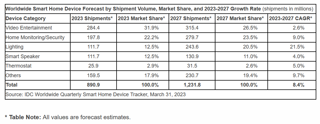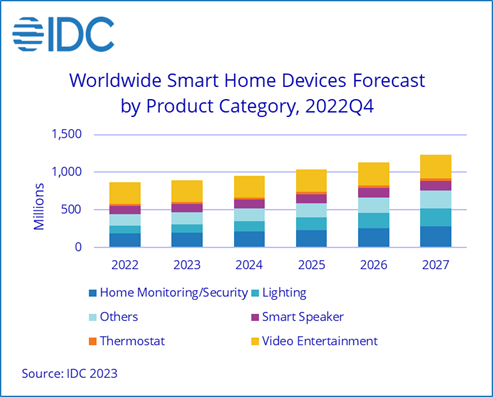 Les ventes de produits pour la "smart home" ont reculé en 2022 mais vont repartir à la hausse en 2023[EDITION ABONNES] En 2022, les livraisons mondiales d'équipements pour la maison intelligente (produits multimédias, sécurité, éclairage, enceintes connectées, thermostats, etc.) ont pour la première fois affiché un recul, estimé par IDC à 2,6% par rapport à 2021, à 871,8 millions d'unités. Les ventes de téléviseurs intelligents (Smart TV), qui représentent la catégorie la plus importante, ont notamment connu une baisse de 4,3% en 2022. Selon la société d’études, le marché des téléviseurs et autres produits du même type s’est en effet avéré extrêmement solide en 2021 en raison des achats liés aux divers confinements imposés par la pandémie de Covid-19. IDC prévoit néanmoins une croissance modeste de 2,2% des livraisons de produits pour la maison intelligente en 2023 parallèlement au redressement de l'économie mondiale. Cette progression devrait se poursuivre jusqu'en 2027, avec des volumes livrés de l’ordre de 1,23 milliard d’unités cette année-là. « Les téléviseurs intelligents connaîtront probablement une autre année de déclin en 2023 en raison des pressions macroéconomiques et des longs cycles de remplacement, note Jitesh Ubrani, responsable d’enquêtes pour les secteurs de la mobilité et de l’électronique grand public chez IDC. Avec l'arrivée récente sur le marché de marques telles qu'Amazon et Roku, nous nous attendons à de nouvelles baisses des prix de vente moyens des téléviseurs qui s’accompagneront de prix plus abordables pour les fonctionnalités haut de gamme. »