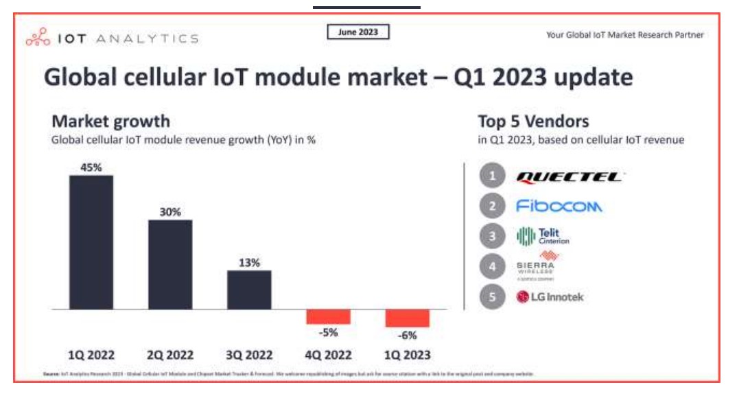 Le marché mondial des modules IoT cellulaires a reculé de 6% au premier trimestre 2023[EDITION ABONNES] Le chiffre d’affaires généré par les ventes de modules radio cellulaires destinés à l’Internet des objets (IoT) a reculé de 6% au premier trimestre 2023 par rapport à la même période de l’année dernière, tandis que les livraisons ont baissé de 16%. La société d’études IoT Analytics note toutefois que le marché des modules IoT cellulaires ne représente qu’environ 3% du marché mondial de l’IoT d’entreprise, de sorte que l'impact de ce segment reste limité sur le paysage global de l’Internet des objets. L’analyste explique ce recul par trois principaux facteurs que sont les dépenses prudentes des utilisateurs finaux, la réduction des stocks et les problèmes d'approvisionnement en semi-conducteurs. Le rythme d’achat des modules de connectivité IoT ont en effet ralenti en raison de contraintes budgétaires dans un environnement économique incertain, caractérisé par une forte inflation, des tensions commerciales, une instabilité politique et les effets post-pandémie en Chine. En réponse à ces incertitudes économiques, les fabricants d'équipements qui intègrent des modules IoT dans leurs produits se focalisent donc sur la réduction des coûts et l’amélioration de l’efficacité de la gestion de leurs stocks, explique IoT Analytics. Dès lors les commandes sont retardées et les quantités demandées sont réduites. « Certains de nos clients ont repoussé leurs commandes un peu plus tard dans l’année à cause du niveau élevé de leurs stocks », a ainsi indiqué un fabricant de modules IoT cellulaires à la société d’études. Enfin, bien que les délais de livraison de la plupart des semi-conducteurs standard se soient régulièrement améliorés depuis début 2022, ces délais restent particulièrement élevés pour certaines puces spécifiques, notamment pour celles mises en œuvre dans les modules de connectivité V2X pour l'industrie automobile.