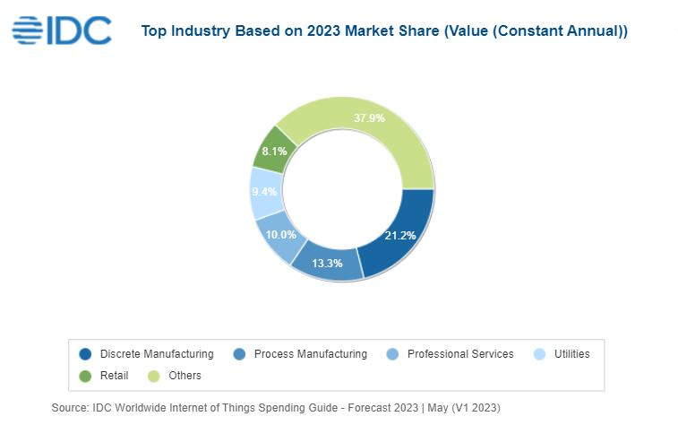 Les dépenses mondiales dans le domaine de l’Internet des objets vont dépasser les 1 000 milliards de dollars en 2026[EDITION ABONNES] 805,7 milliards de dollars. Tel est le montant que devraient atteindre en 2023 les dépenses mondiales dans le domaine de l'Internet des objets (IoT), soit une augmentation de 10,6% par rapport à 2022. Telle est du moins la prévision de la société d’études IDC qui prédit par ailleurs que les investissements dans l'écosystème IoT devraient dépasser les 1 000 milliards de dollars en 2026 pour une croissance moyenne de 10,4% par an sur la période 2023-2027. La fabrication discrète et l’industrie des procédés sont les secteurs qui verront les plus gros investissements dans les solutions IoT en 2023 ainsi que tout au long de la période de prévision, ajoute l’analyste, ces secteurs devant absorber plus d'un tiers de toutes les dépenses IoT dans le monde. Les services professionnels, les services publics et la vente au détail, quant à eux, arrivent juste derrière avec environ 25% des dépenses IoT mondiales. Mais ce sont les investissements IoT des Etats et des administrations locales et ceux du secteur des télécommunications qui devraient afficher la croissance la plus rapide au cours des cinq prochaines années avec, respectivement, une augmentation moyenne de 12% et de 11,7% par an.
