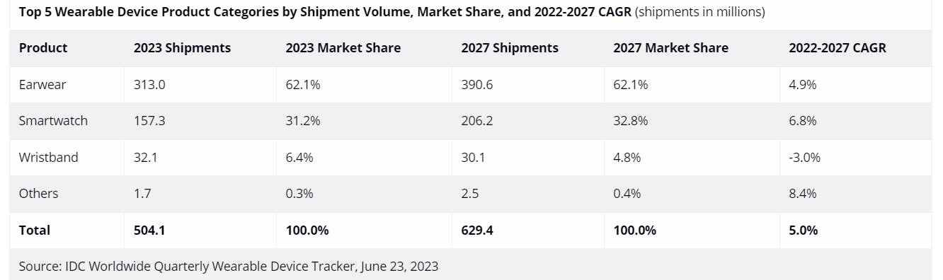 Après un recul en 2022, le marché en volume des dispositifs électroniques portés sur soi repart à la hausse[EDITION ABONNES] Après avoir reculé pour la première fois en 2022, les livraisons mondiales de dispositifs électroniques portés sur soi (les fameux wearables) devraient rebondir en 2023 pour atteindre un total de 504,1 millions d'unités, en progression de 2,4% par rapport à 2022. Selon IDC, cette croissance est tirée par une demande soutenue pour les produits les plus populaires - les écouteurs et les montres connectées - tandis que les ventes des autres wearables sont restées stables. A moyen terme, la société d’études s'attend à ce que le marché connaisse plusieurs années de progression à un chiffre avec des livraisons de l’ordre de 629,4 millions d'unités en 2027 pour une croissance moyenne de 5% par an. Les écouteurs et autres dispositifs portés sur les oreilles resteront les produits vendus en plus grande quantité tout au long de la période de prévision, estime la société d’études, en raison de l’arrivée de nouveaux utilisateurs et du désir des utilisateurs actuels souhaitant renouveler des appareils achetés en 2020 et 2021, lorsque les ventes d'écouteurs étaient au plus haut.