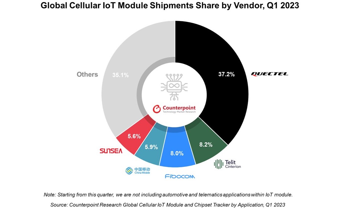 Plus de la moitié des modules IoT cellulaires livrés au premier trimestre 2023 étaient signés Quectel, Telit Cinterion ou Fibocom[EDITION ABONNES] Selon les données publiées durant l’été par la société d’études Counterpoint, les livraisons mondiales de modules IoT cellulaires (hors modules embarqués et télématiques pour le marché automobile) sont restées stables au premier trimestre 2023 par rapport à la même période de l'année dernière. Dans ce cadre, plus de la moitié des modules IoT cellulaires livrés au premier trimestre 2023 étaient signés par l’un des trois premiers du secteur, soit Quectel, Telit Cinterion ou Fibocom. À l'échelle mondiale, le chinois Quectel a continué de dominer le marché, suivi d’assez loin par la nouvelle entité Telit Cinterion, formée après l'acquisition par Telit des activités liées aux modules IoT cellulaires de Thales en 2022. Telit Cinterion a ainsi pu se hisser à la deuxième position sur le marché mondial après la fusion, permettant à l'ancien Telit de combler l'écart avec Quectel sur le marché international en dehors de la Chine. Selon Counterpoint, Telit Cinterion peut désormais être considéré dans une certaine mesure comme l'un des plus grands acteurs occidentaux de l’IoT verticalement intégrés. La société bénéficie en particulier d'une position forte sur les marchés nord-américains et européens à forte valeur ajoutée. La troisième place a été prise par un autre acteur à croissance rapide basé en Chine, Fibocom en l’occurrence. Ce dernier a connu une croissance impressionnante au premier trimestre 2023, suffisante pour se distinguer parmi les trois premiers acteurs mondiaux, assure la société d’études. Sa présence dans le segment des routeurs et des box et sur celui des terminaux de points de vente (POS) a permis à Fibocom d’entrer dans le trio de tête sur le marché chinois et dans la liste des cinq premiers pour les marchés internationaux hors Chine.