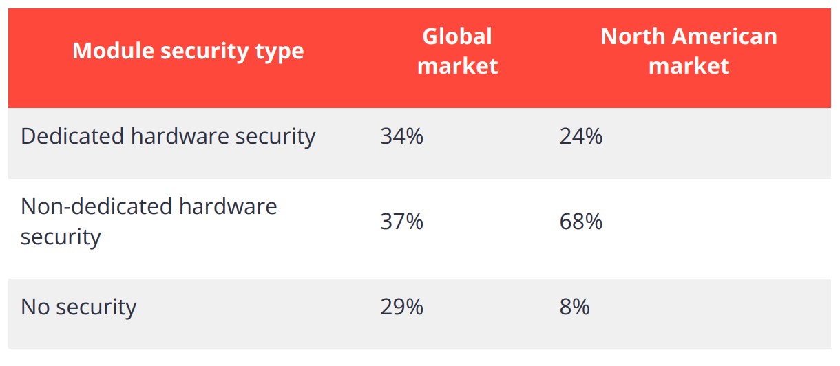 Face à cette stagnation qui s’explique par l’environnement macroéconomique, la société d’études a préféré en ce deuxième trimestre 2023 porter son attention sur la sécurité des modules IoT cellulaires en examinant les fonctionnalités de sécurité de 772 modules différents proposés par 36 fournisseurs et de quelque 150 puces ad hoc au catalogue de 13 sociétés de semi-conducteurs. De fait, la sécurité des modules IoT est placée sous les feux de l’actualité depuis quelques semaines, à la lumière de la lettre du Congrès américain envoyée le 7 août dernier à la FCC, l’organisme de régulation des télécoms outre-Atlantique, et portant sur les risques de sécurité potentiels liés à l'utilisation des modules IoT cellulaires des fournisseurs chinois. Une lettre qui a fait réagir les deux premiers acteurs du marché, Quectel et Fibocom, originaires de l'empire du Milieu, qui se sont sentis obligés de publier un communiqué contestant cette assertion. Selon IoT Analytics, sur les modules et puces disponibles au deuxième trimestre 2023 et dûment répertoriés par l’analyste, 30% d’entre eux disposaient de fonctionnalités de sécurité matérielle spécifiques, souvent intégrées dans des puces-systèmes ou dans des composants autonomes mis en œuvre sur des modules de sécurité ad hoc. 42% étaient quant à eux dotés de fonctionnalités de sécurité matérielles généralistes (comme la technologie TrustZone, mise en œuvre dans certains microcontrôleurs à architecture Arm) ou de fonctionnalités utilisées pour créer des environnements sécurisés pour l'exécution de processus ou garantir que seul un micrologiciel autorisé peut être téléchargé dans l'équipement. Enfin 28% des modules examinés par IoT Analytics n'avaient aucun élément de sécurité à bord.