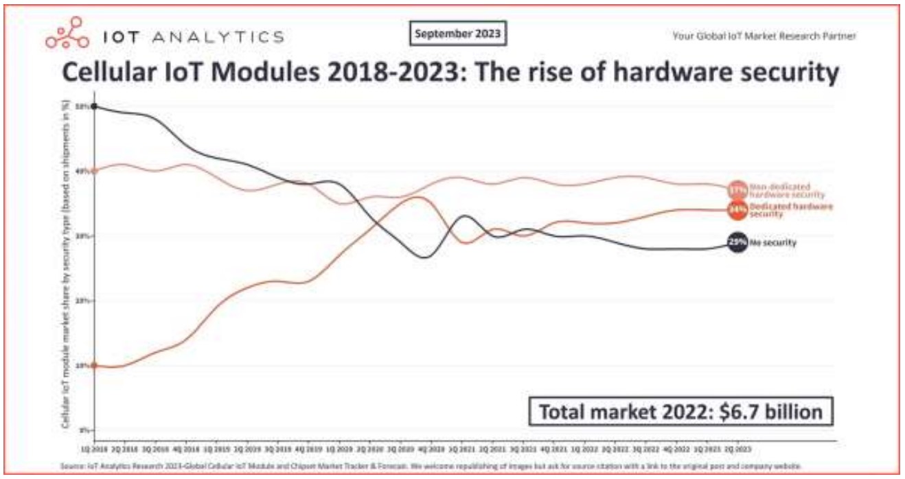Près de 30% des modules IoT cellulaires livrés au deuxième trimestre 2023 n’intégraient aucune fonctionnalité de sécurité[EDITION ABONNES] Quand on évoque la sécurité de l’Internet des objets (IoT), force est de constater qu’il y a encore de (gros) trous dans la raquette. Ainsi 29% des modules IoT cellulaires livrés au deuxième trimestre 2023 n’étaient dotés d’aucune fonctionnalité de sécurité et seuls 34% disposaient d’une sécurité reposant sur des ressources matérielles spécifiques. Tel est le constat de la société d’études IoT Analytics qui note par ailleurs une stabilisation des livraisons et du chiffre d’affaires généré par les ventes de modules IoT cellulaires sur la période par rapport au premier trimestre 2023. (On rappellera que l’analyste a estimé le marché 2022 à 6,7 milliards de dollars.)