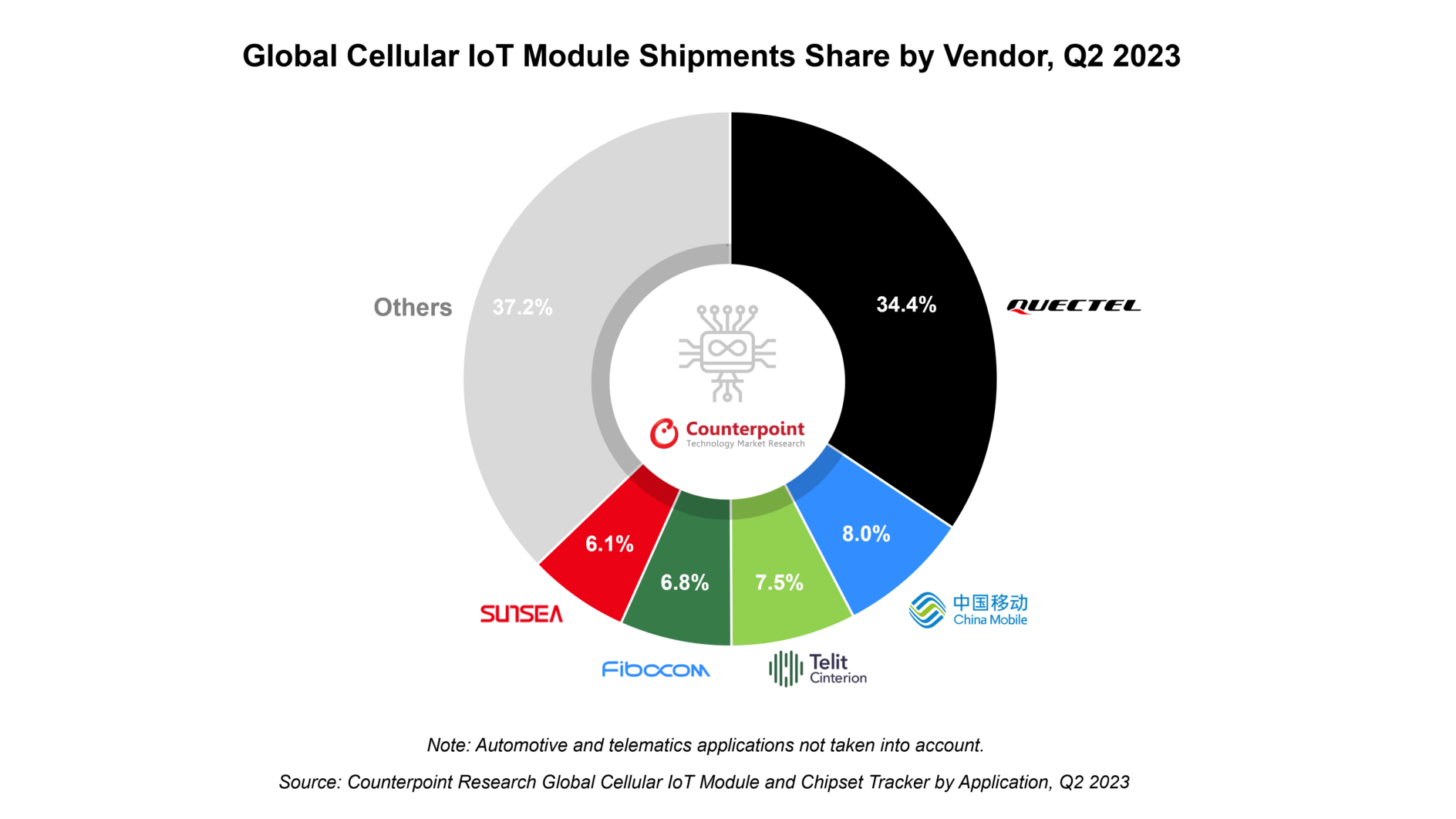 Les ventes en volume de modules IoT cellulaires ont baissé de 5% au 2e trimestre 2023 par rapport à l’année précédente[EDITION ABONNES] Les livraisons mondiales de modules radio cellulaires destinés à l’Internet des objets (IoT) (à l’exclusion des modules embarqués et télématiques pour le marché automobile) ont enregistré un recul de 5% sur un an au deuxième trimestre 2023. Seule l'Inde a connu une croissance positive des expéditions pour le trimestre considéré. Selon la société d’études Counterpoint. ce recul s’explique notamment par une baisse de la demande et un environnement économique peu favorable. À l’exception des deux principales applications pour modules IoT cellulaires, les compteurs intelligents et les terminaux de point de vente (POS), la plupart des segments ont de fait connu une forte baisse des ventes en volume. A eux seuls, les segments de compteurs intelligents, des terminaux POS et des traceurs d'actifs ont représenté environ 56% du marché au deuxième trimestre 2023, précise encore l’analyste. « Au deuxième trimestre 2023, de nombreux fournisseurs de modules IoT cellulaires ont connu une baisse des expéditions au moment où le marché s’est contracté pour la première fois depuis le début de la pandémie de Covid-19, précise Mohit Agrawal, directeur associé de Counterpoint. La demande d’appareils connectés induite par la pandémie s’affaiblit tandis que les efforts de transformation numérique du secteur industriel et d’autres marchés verticaux clés ne se traduisent pas encore en livraisons. »