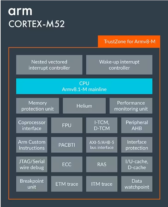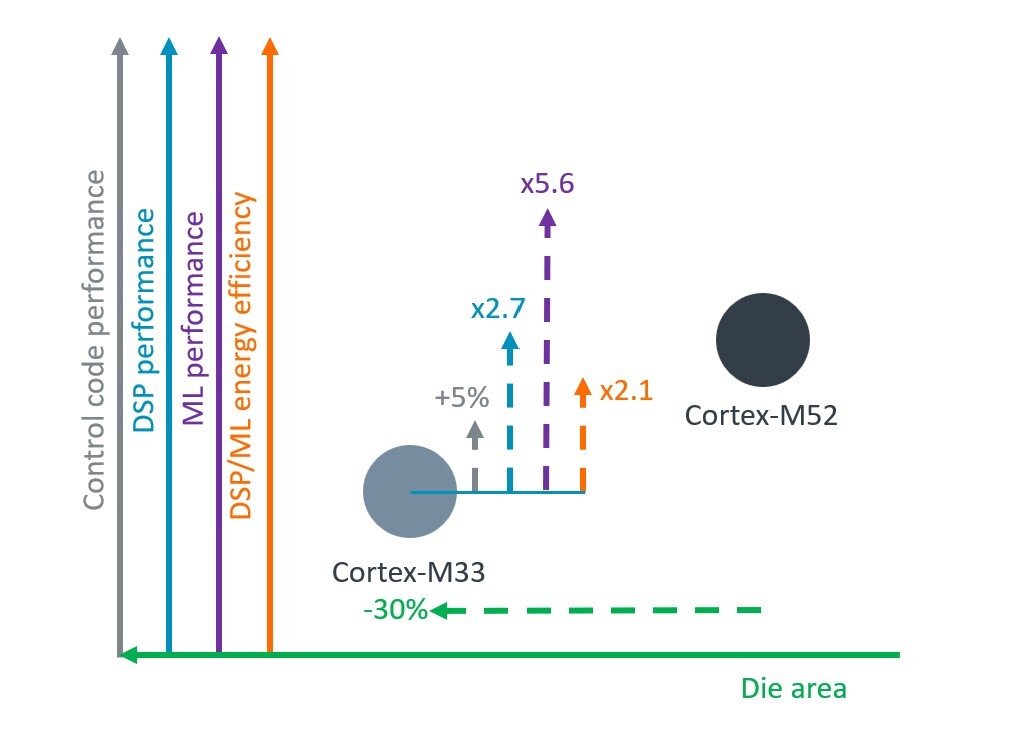 Selon Arm, le dernier-né des Cortex-M offre une amélioration significative des performances dans les applications DSP et ML pour les petits appareils embarqués à faible consommation, permettant de déployer des algorithmes d'inférence ML plus gourmands en puissance de calcul dans des nœuds d’extrémité sans recourir à une unité neuronale spécifique. Avec à la clé des gains en surface de silicium et des coûts réduits. En étendant la technologie Helium à une nouvelle classe de cœurs Cortex-M, Arm estime apporter un changement radical dans la manière d’effectuer des calculs matriciels et des traitements DSP sur des microcontrôleurs embarqués dans des appareils toujours plus compacts. Le Cortex-M52 offrirait en outre une voie de migration simplifiée à partir des cœurs Cortex-M33 et Cortex-M4 en ciblant un large éventail d'applications AIoT nécessitant des expériences utilisateur, vocales et visuelles plus riches, telles que le contrôle automobile et industriel, la maintenance prédictive et la fusion de capteurs dans les dispositifs électroniques portés sur soi. Au global, ajoute Arm, le Cortex-M52 amène la gamme des cœurs Cortex-M alignés sur l’architecture Armv8.1-M (qui comprend le Cortex-M55 et le Cortex-M85) à un nouveau point d'efficacité, une étape jugée critique dans l'apport des capacités ML aux microcontrôleurs. Au sein du portefeuille Cortex-M, il met en œuvre la technologie Helium dans l’empreinte silicium la plus compacte et pour la consommation d’énergie la plus faible, offrant ainsi un choix supplémentaire aux fournisseurs de semi-conducteurs qui cherchent à faire un compromis entre performances et coûts.