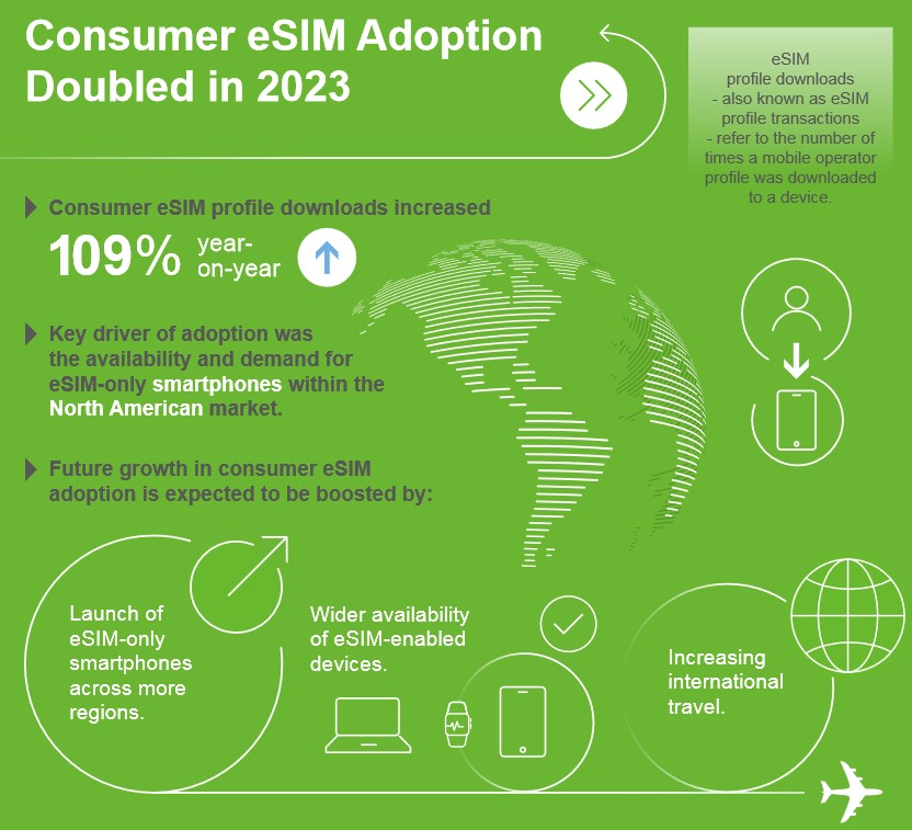 Les téléchargements de profils eSIM for Consumer ont plus que doublé en 2023 grâce aux smartphones "eSIM-only"[EDITION ABONNES] Selon la Trusted Connectivity Alliance (TCA), l’adoption de la technologie eSIM (embedded SIM) dans le secteur grand public continue de progresser rapidement, les téléchargements de profils eSIM for Consumer ayant plus que doublé en 2023 (+109% par rapport à 2022). Cette croissance a été principalement tirée par le marché nord-américain où de nombreux modèles de smartphones "eSIM-only" (sans carte SIM traditionnelle donc) sont disponibles et où la demande pour ce type de terminaux est forte, poussant les principaux opérateurs de téléphonie mobile à passer au tout-numérique. Les taux d’adoption ont également doublé en Asie et en Europe occidentale, note l’organisme industriel.