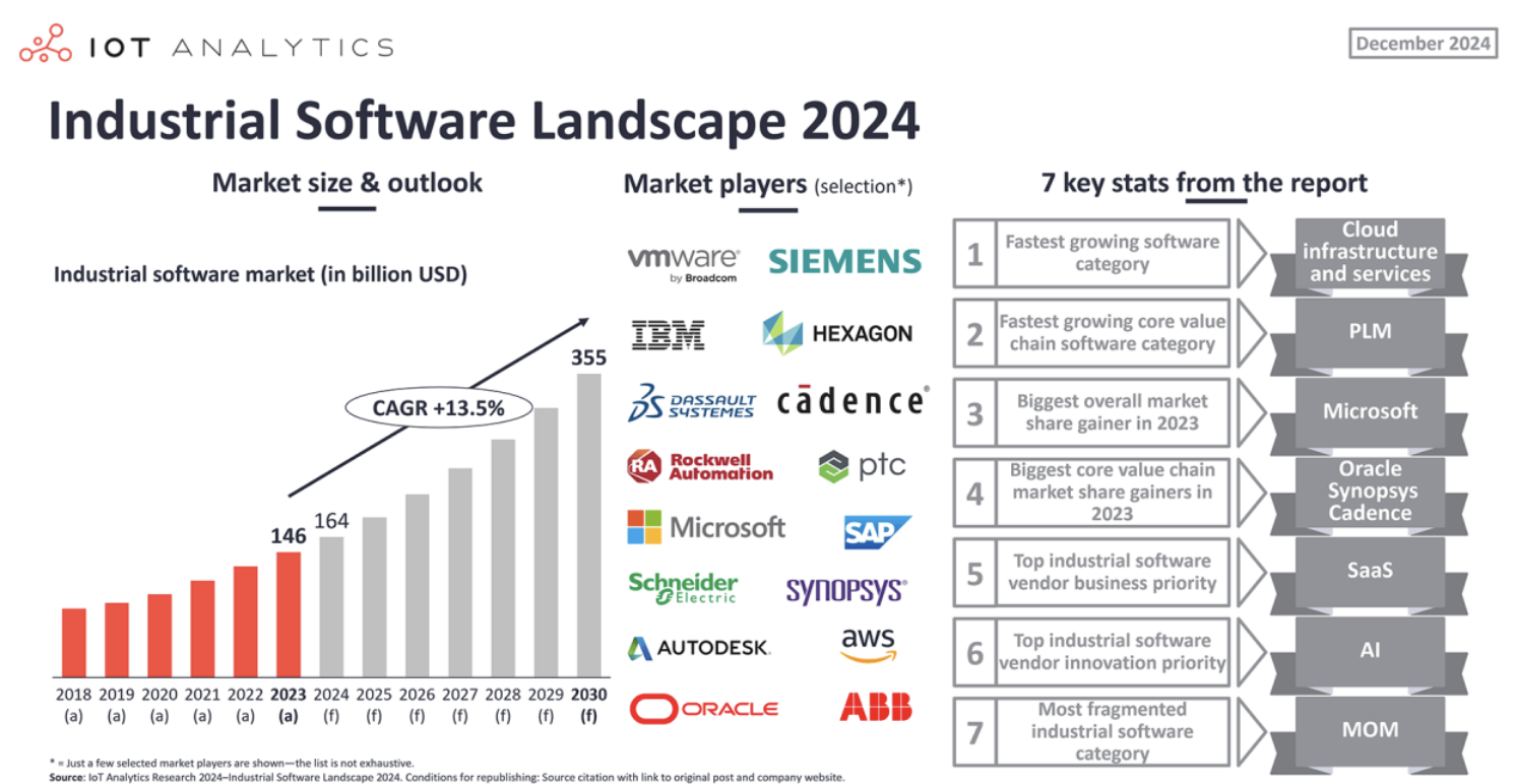 Au-delà, la force de Microsoft, selon IoT Analytics dans son rapport, est la position que la société a récemment acquise sur le marché au niveau de la gestion des logiciels d’IA dans le cloud et le développement de l’IA générative pour l’industrie. D’autres sociétés, comme Oracle, Synopsys et Cadence ont-elles aussi gagné des parts de marché significatives depuis 2021, si l’on ne croit les conclusions du rapport d’étude. Le gain de parts de marché d'Oracle est attribué à ses logiciels de planification, de conception et d'exécution de la chaîne d'approvisionnement, à ses services cloud et à ses logiciels de service sur le terrain. Pour ces logiciels industriels, la principale priorité commerciale des éditeurs, notée par IoT Analytics, est la mise en place de solutions de type SaaS avec une volonté affichée d’accroitre leurs revenus à travers cette approche. Bien que peu de fournisseurs rendent publique leurs chiffres de revenus pour les solutions en SaaS ceux qui le font ont en commun une augmentation de la part du SaaS dans leur revenus global. Par exemple, pour l’allemand SAP, société de logiciels d’entreprise, le SaaS représentait 41 % de son chiffre d’affaires en 2023, contre 34 % en 2022. Et pour l’avenir, SAP veut faire en sorte que tous les utilisateurs de ses logiciels passent à des solutions basées sur le cloud d’ici 2027, avec des licences SaaS. Dans le même temps, Dassault Systèmes, société française de logiciels de conception et de fabrication 3D, a indiqué que 24 % de ses revenus logiciels pour l'exercice 2023 provenaient des revenus du cloud, en hausse de 12 % par rapport à l'exercice 2022.