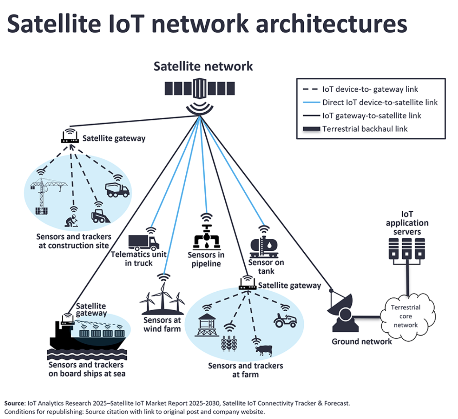 Le marché de l'IoT par satellite devrait croître de 26 % par an pour atteindre 4,7 milliards de dollars d'ici 2030[EDITION ABONNES] Selon une récente étude de la société d’analyse de marché IoT Analytics, publiée dans un rapport intitulé "Satellite IoT Market Report 2025–2030", le marché mondial de la connectivité et des équipements IoT par satellite se développe très rapidement, avec un taux de croissance moyen annuel estimé à 26 %, pour atteindre 4,7 milliards de dollars d'ici 2030. Sur la base de cette étude, IoT Analytics a dégagé cinq facteurs clés qui sont à l’origine de cette forte progression. Tout d’abord, les progrès technologiques réduisent les coûts. L'industrie des satellites passe des satellites géostationnaires lourds (à la miniaturisation rentable de satellites en orbite basse l'orbite terrestre basse (LEO). De plus, la conception standardisée et modulaires des satellites réduisent leurs coûts, y compris au niveau des frais de lancements. Second facteur, les coûts de connectivité par satellite diminuent grâce à des satellites plus petits et évolutifs avec côté fournisseur des stratégies de réseau multi-orbites et hybrides. Celles-ci permetteht d’optimiser la connectivité par satellite pour les applications IoT grâce notamment à des collaborations qui se mettent en place entre opérateurs de réseaux mobiles et opérateurs de réseau satellitaires ce qui favorise une connectivité hybride satellite-terrestre. Troisième facteur, au fur et à mesure que de nouvelles normes apparaissent, la part de marché prise par les satellites traditionnels devrait diminuer considérablement d'ici 2030, avec l'arrivées des satellites en orbite basse dotés de modules IoT intégrés délivrant de multiples options de connectivité pour plus de flexibilité. Quatrième facteur, IoT Analytics constate que les gouvernements investissent de plus en plus fréquemment dans des initiatives de mise en oeuvre de méga-constellations. A l’heure actuelle ces entités étatiques sont les principaux moteurs de la demande en infrastructures satellitaires. Enfin, le rapport d’IoT Analytics indique qu’une utilisation croissante de la connectivité par satellite apparait notamment dans les secteurs de l'automobile et des transports. Ces domaines d’utilisation de l’IoT satellitaire devraient même à terme dominer l'utilisation de la connectivité au standard 3GPP NTN (Non Terrestrial Network).