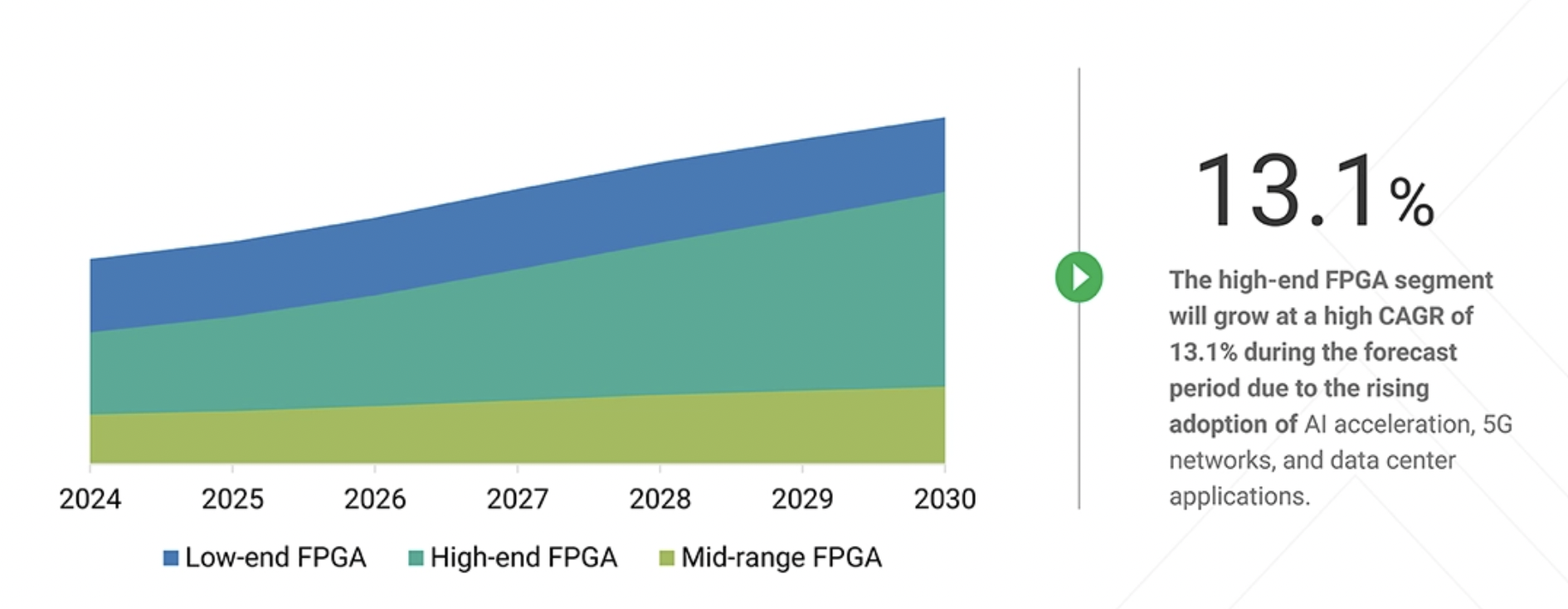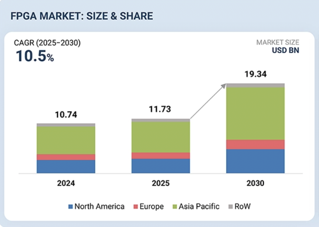 Le marché global des FPGA et eFPGA passerait de 11,73 Md$ en 2025 à 19,34 Md$ en 2030[EDITION ABONNES] Selon un récent rapport de la société d’analyse économique Marketsandmarkets (*), le marché des FPGA (Field-Programmable Gate Array) devrait atteindre 19,34 milliards de dollars en 2030, contre 11,73 en 2025, soit une croissance annuelle composée de 10,5 % sur cette période. Pour rappel, un FPGA est un semi-conducteur reconfigurable, programmable après sa fabrication, pour exécuter des fonctions logiques spécifiques ou des tâches de traitement numérique. Selon Marketsandmarkets, l’industrie des FPGA est actuellement portée par la demande croissante de puissance de calcul personnalisable et performante dans les centres de données, les télécommunications et l'automobile, ainsi que par leur adoption croissante dans l'accélération des algorithmes d’intelligence artificielle (IA), l'infrastructure 5G et les systèmes de calcul en périphérie de réseau (edge computing). Ce marché des FPGA, segmenté en circuits d’entrée, de milieu et de haut de gamme pour répondre aux exigences des applications en matière de performances, de coût et de consommation énergétique, devrait voir la partie d’entrée de gamme dominer le marché grâce à une adoption généralisée de ce type de circuit dans l'électronique grand public, l'automatisation industrielle et les systèmes embarqués à faible coût, indique Marketsandmarkets. Côté fabrication, on trouve sur le marché des FPGA fabriqués avec des nœuds de gravure de 16 à 90 nm, voire au- delà, procurant différents compromis entre consommation énergétique, performances et densité. Dans ce paysage, le nœud inférieur à 16 nm devrait connaître la croissance la plus rapide du marché en raison de la demande croissante de FPGA haute vitesse et basse consommation pour l'accélération de l'IA, les centres de données et les applications de réseau avancées, note le rapport. En termes de technologie, le segment des FPGA à base de Sram détient la plus grande part de marché grâce à ses possibilités de reconfiguration supérieures, ses hautes performances et son adéquation aux conceptions de systèmes complexes dans les centres de données et les télécommunications. Parallèlement, le segment des eFPGA, technologie qui permet d’insérer de la logique programmable et reconfigurable dans des circuits ASIC afin d'améliorer leur adaptabilité, devrait afficher une croissance notable.