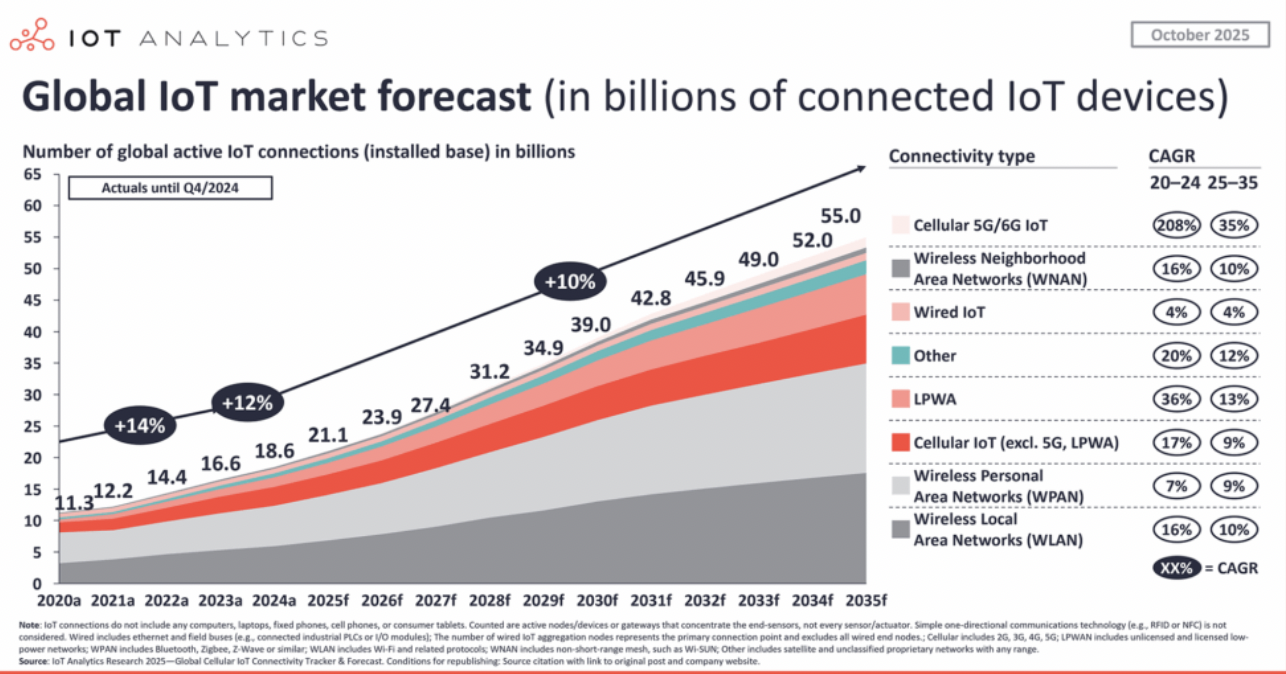 IoT : le nombre d'objets connectés passerait de 18,5 milliards en 2024 à 39 milliards en 2030 dans le monde porté par le Wi-Fi, le LTE et la 5G[EDITION ABONNES] Selon une récente étude de la société d’analyse économique IoT Analytics, le nombre d'objets connectés (IoT) dans le monde devrait croitre de 14% sur la période 2024 - 2030, passant de 18,5 milliards en 2024 (en croissance de 12% par rapport à 2023) à 39 milliards en 2030, pour atteindre plus de 50 milliards d'ici 2035. Sur le long terme, l'intelligence artificielle (IA) devrait être un moteur de croissance clé durant cette période, la demande de données des appareils augmentant au rythme des progrès de l'IA. Après 2030, la croissance devrait cependant ralentir, selon IoT Analytics, le nombre d'appareils non connectés susceptibles d'apporter une valeur ajoutée à la connectivité diminuant. Néanmoins, la saturation complète du marché n'est pas attendue avant 2035. Au niveau des technologies, trois d’entre elle représentent près de 80% des connexions IoT. En premier, le Wi-Fi qui s’arroge 32% des connexions IoT, dont le rôle devrait s'étendre, porté par trois tendances clés, selon IoT Analytics. D’abord, l'adoption du Wi-Fi basse consommation grâce à l'utilisation des fonctionnalités du Wi-Fi 6, telles que Target Wake Time et les modes de veille étendus, pour réduire la consommation d'énergie et permettre ainsi l'utilisation de capteurs, de serrures et d'appareils électroménagers alimentés par batterie. Ensuite les mises à niveau des équipements d'entreprise, chez les particuliers, et des infrastructures s'accélèrent avec le remplacement des anciens réseaux par le Wi-Fi 6E et le Wi-Fi 7, améliorant le débit, la latence et la fiabilité. Tandis que le renouvellement des passerelles d'accès haut débit et d'accès sans fil fixe (FWA) contribue à cette dynamique. Enfin, l’arrivée du Wi-Fi HaLow (norme IEEE 802.11ah) en dessous du GHz, procure des liaisons longue portée et basse consommation pour les applications IoT industrielles et extérieures, telles que les capteurs vidéo, l'AMI 2.0 et l'agriculture de précision. La seconde technologie la plus utilisée est le Bluetooth pour laquelle on compte 24% des objets connectés qui l’utilise. Le Bluetooth Low Energy (BLE) continue de dominer la connectivité IoT alimentée par batterie, grâce à l'adoption de nouveaux circuits de type puce-système (SoC, Sysqtem On Chip) comme le nRF54 de Nordic, le BG27 de Silicon Labs et les familles CC23xx de TI, qui intègrent calcul, radio et sécurité tout en réduisant les coûts et la consommation d'énergie. Parallèlement, l’adoption industrielle du Bluetooth progresse grâce à la technologie IO-Link Wireless qui assure une communication sans fil fiable entre capteurs, actionneurs et contrôleurs en s’appuyant sur le Bluetooth IEEE 802.15.1. Au-delà, le Bluetooth 5.4 s'impose comme une plateforme de choix pour les étiquettes électroniques de grande surface, avec des déploiements nationaux en cours en Amérique du Nord et en Europe. Sans oublier que le Channel Sounding, technologie apparue dans le Bluetooth 6.0 et qui prend en charge le positionnement précis et sécurisé pour le contrôle d'accès, les systèmes de localisation en temps réel (RTLS) et les clés numériques automobiles, accroît encore la demande d'infrastructures dans les hôpitaux, les usines et les entrepôts. Enfin, troisème technologie de connexion à l'oeuvre est l’IoT cellulaire - 2G, 3G, 4G, 5G, LTE-M et NB-IoT - qui représente 22 % des connexions IoT mondiales. Selon l’étude "Global Cellular IoT Connectivity Tracker & Forecast" d'IoT Analytics (mis à jour en septembre 2025) ces connexions IoT cellulaires mondiales ont progressé de 16 % en glissement annuel en 2024, dépassant ainsi la croissance globale de l'IoT. De même, le rapport d'IoT Analytics intitulé “Wireless IoT Connectivity Chipset Market Report 2025–2030” (publié en octobre 2025) indique que le marché des puces IoT cellulaires a atteint 4,07 milliards de dollars en 2024 (+19 % par rapport à l'année précédente) et devrait atteindre 14,08 milliards de dollars d'ici 2030 (croissance annuelle de 23 %). Dans ce cadre, les puces 5G devraient être le principal moteur de cette croissance avec un marché projeté à 9,31 milliards de dollars d'ici 2030, soit un taux moyen annuel de croissance de 34 %, porté par le FWA (Fixed Wireless Access), la télématique vidéo, les passerelles industrielles et l'automobile, le déploiement à grande échelle de la 5G privée en Chine. Ensuite, le LTE Cat-1 continue de se développer en tant que solution économique pour les dispositifs IoT de milieu de gamme, notamment dans les domaines de la logistique, du comptage et des villes intelligentes; troisième tendance. Enfin, le LTE Cat-1 bis s'impose désormais comme la principale option à grand volume, remplaçant la 2G et la 3G et prenant en charge des applications telles que les points de vente, le suivi des actifs et la télématique légère.