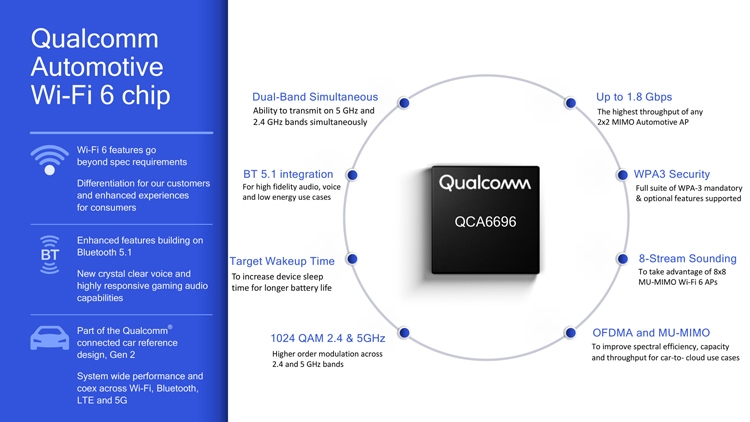 Qualcomm pousse la technologie Wi-Fi 6 dans l’automobile[EDIITION ABONNES] Tout comme Marvell et Cypress (entre autres), Qualcomm a bien l’intention de faire monter dans les véhicules le standard Wi-Fi 6 (appellation officielle de la norme IEEE 802.11ax selon la Wi-Fi Alliance). La société de semi-conducteurs a commencé l’échantillonnage d’une puce Wi-Fi 6 qualifiée automobile ...(QCA6696), présentée comme la solution Wi-Fi la plus avancée de Qualcomm et apte à répondre aux exigences de robustesse et de latence des utilisateurs dans des environnements denses et congestionnés. Venant en complément des plates-formes 4G et 5G Snapdragon Automotive de l’Américain, la puce QCA6696 offre des fonctions de double point d’accès Wi-Fi 6, permettant de proposer une connectivité Wi-Fi de niveau gigabit dans le véhicule pour, notamment, le streaming de contenus vidéo à ultrahaute définition vers plusieurs afficheurs, le report d’interfaces utilisateur de smartphones sur l’écran du système d’infodivertissement ou la diffusion d’images prises par des caméras arrière. Le circuit prend également en charge le standard Bluetooth 5.1 (lire notre article ici) et la technologie audio Qualcomm aptX Adaptive, caractéristiques destinées à assurer la transmission de signaux vocaux à haute-fidélité et la diffusion de l’audio. Le QCA6696 peut également jouer le rôle de client Mimo (Multiple Input Multiple Output) afin d’augmenter la portée des communications à haut débit avec des points d’accès extérieurs à l’automobile dans le cadre de services automobiles comme les diagnostics véhicule, les mises à jour logicielles ou les contrôles automatiques lors de l’arrêt chez un concessionnaire. Dans le détail la puce est apte à soutenir un débit de pratiquement 1,8 Gbit/s dans des environnements denses grâce au procédé DBS (Dual-Band Simultaneous) et à la modulation 1024QAM dans les bandes 2,4 GHz et 5 GHz. Elle implémente également les mécanismes de sécurité WPA3 (publiés en 2018) et WPA3-Easy Connect (lire notre article ici). Selon Qualcomm, le circuit QCA6696 devrait être embarqué dans des véhicules commerciaux à partir de 2021. Il sera également présent sur la plate-forme Qualcomm Connected Car Reference Design (CCRD) de 2e génération de l’Américain, censée faciliter la coexistence pacifique de différentes technologies radio (4G/5G, C-V2X, Wi-Fi 6, Bluetooth 5.1, GNSS) au sein d'une automobile. Prévue pour une disponibilité au cours du second semestre, cette plate-forme devrait aussi embarquer un processeur d’application Qualcomm spécifique doté d’accélérateurs de sécurité pour le C-V2X ainsi que la technologie Qualcomm VEPP (Vision Enhanced Precise Positioning) qui permet de fusionner des données issues de plusieurs capteurs automobiles (géolocalisation par satellite GNSS, caméra, centrale inertielle, odomètres) pour assurer un positionnement particulièrement fin du véhicule et bâtir des cartographies à partir d’informations de conduite précises à la voie près (moins d’un mètre).