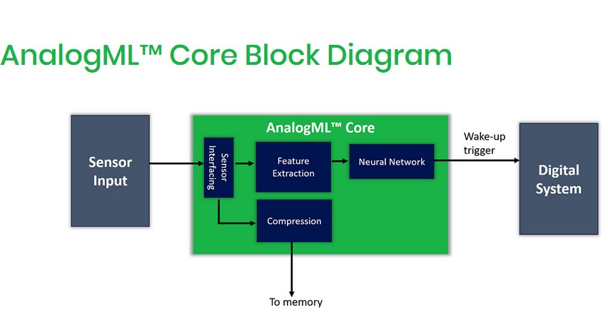 Le premier produit d’Aspinity, le cœur d'apprentissage automatique analogique AML100, offrirait des économies d'énergie substantielles au niveau système en déplaçant la charge de travail ML vers l'analogique à ultrabasse consommation, là où la puce peut déterminer la pertinence des données avec un degré élevé de précision et pour une consommation proche de zéro. Dans ce cadre, l'AML100 maintient le microcontrôleur hôte et les autres processeurs numériques en veille jusqu'à ce que des données significatives soient détectées.