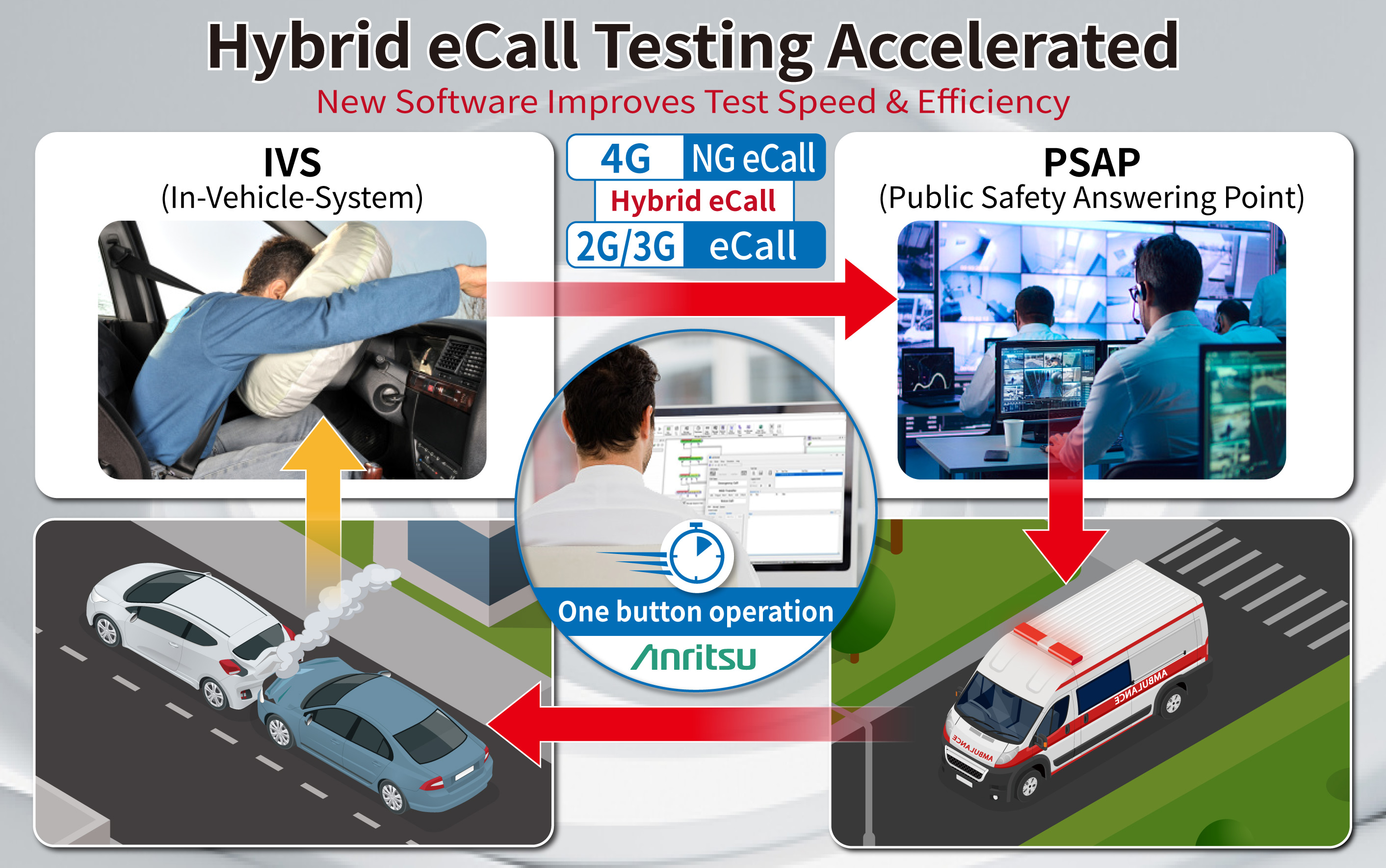 Le fournisseur de systèmes de test est mesure japonais Anritsu, lance une solution de test conforme à la norme EN 18052:2025 pour la certification des systèmes de signalisation "Hybrid eCall" mis en branle en cas d'accident d'une voiture.
