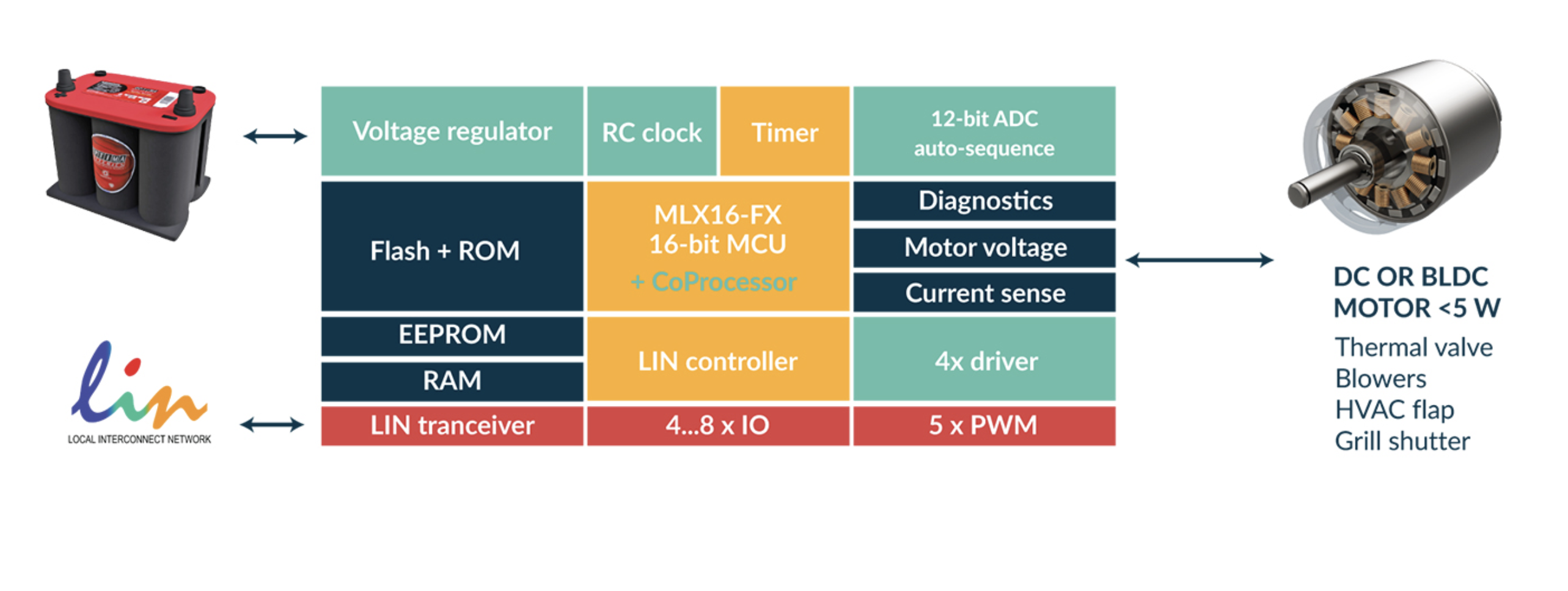 Pour ce domaine, le circuit MLX81350, programmable par flash, apporte est un pilote de moteur connecté à un réseau LIN, fondé sur une technologie SOI (silicon-on-insulator, silicium sur isolant) haute tension.