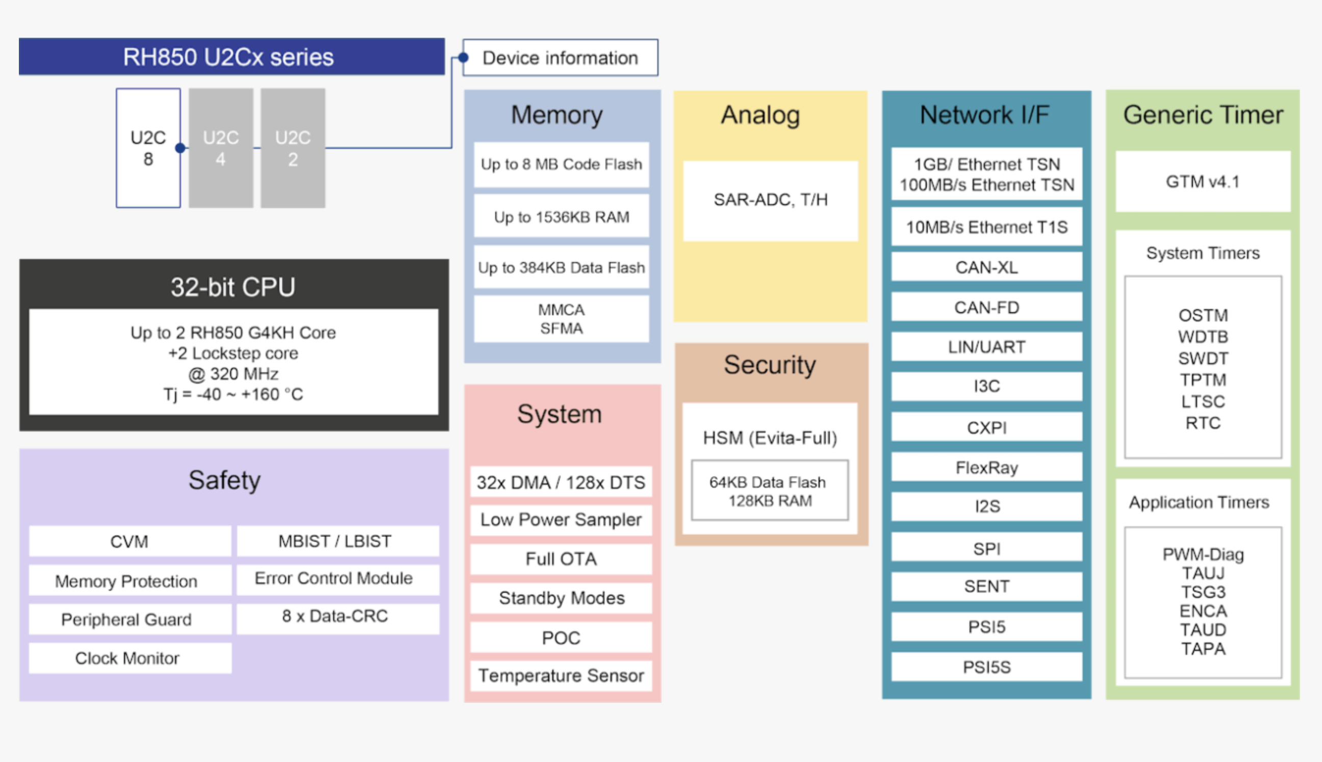 D’un point de vue architecture, le RH850/U2C combine jusqu'à quatre cœurs de processeur RH850 propres à Renesas, fonctionnant à une fréquence maximale de 320 MHz (dont deux cœurs en mode lockstep) avec une mémoire flash intégrée pouvant atteindre 8 Mo. Trois convertisseurs analogiques/numériques sur 12 bits complètent le tableau.