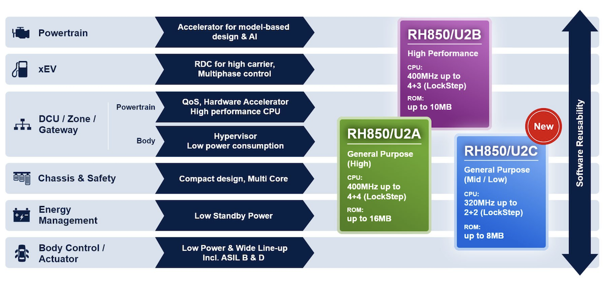 Ce composant, disponible dès aujourd’hui, est en fait une option d'entrée de gamme des microcontrôleurs RH850, venant ainsi compléter les produits haut de gamme RH850/U2B et milieu de gamme RH850/U2A déjà sur le marché depuis trois ans.