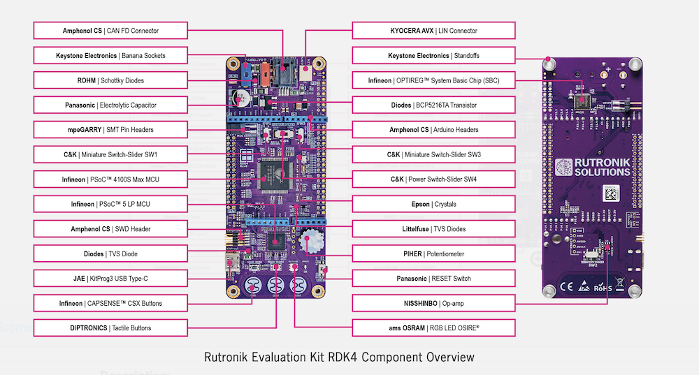 On trouve notamment sur cette carte de prototypage un microcontrôleur (un PSoC 4100S Max d’Infineon)- associé aux interfaces classiques du monde automobile CAN FD et LIN, accessibles grâce à des connecteurs ad hoc de Kyocera.