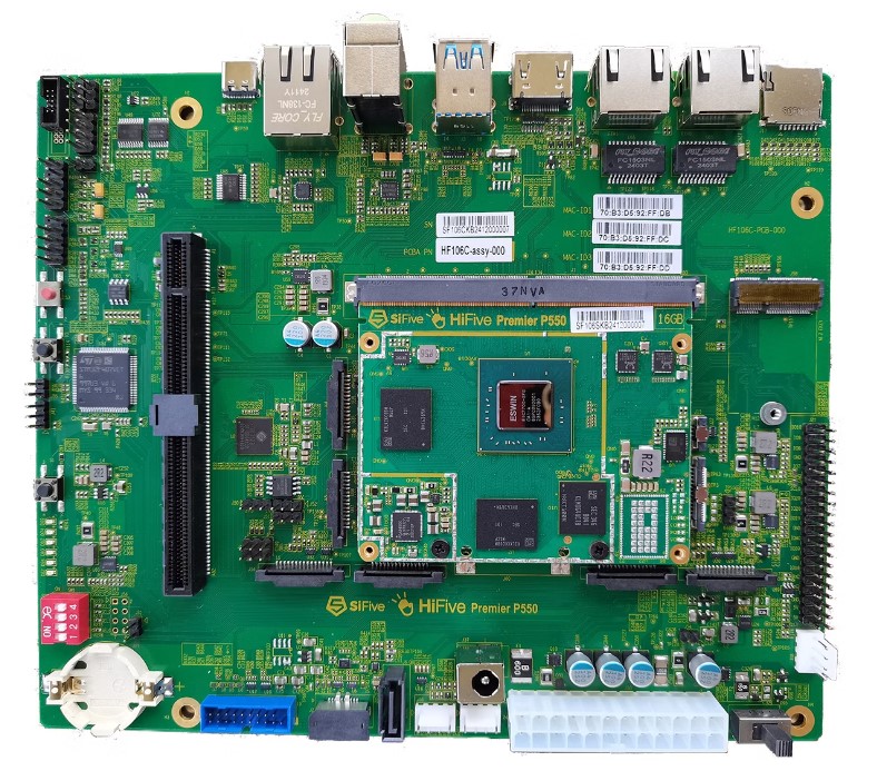 Au-delà, la carte HiFive Premier P550, aux dimensions de 203 x 170 mm, embarque 16 Go de mémoire 64 bits LPDDR5-6400 et 128 Go de mémoire eMMC et dispose d’un emplacement PCIe x16, de cinq ports USB 3, d’un emplacement M.2 E-Key (pour un module Wi-Fi/Bluetooth), d’un double port Gigabit Ethernet et d’un connecteur SATA3.