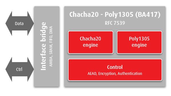 Référencé BA417, ce bloc d’IP implémente en effet un moteur de chiffrement de flux de données ChaCha20 associé à un encodeur d’authentification de messages Poly1305. Poly1305 est un code MAC (Message Authentification Code) utilisé pour vérifier l’authenticité d’un message et l’intégrité des données qu’il véhicule. Tout comme l’algorithme de chiffrement symétrique Chacha20, il a été conçu comme une alternative plus sécurisée aux algorithmes plus anciens mis en œuvre dans le protocole TLS/SSL, le protocole sous-jacent qui sécurise la majorité des communications Internet émanant de navigateurs (HTTPS), de clients VoIP (Voice over IP), de terminaux mobiles ou d’applications IoT.