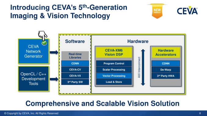 Outre le DSP lui-même, la plate-forme Ceva-XM6 inclut des accélérateurs spécifiques pour l’exécution de réseaux CNN et la suppression de déformations d’image (de-warping), le framework logiciel CDNN2 (Ceva Deep Neural Network), des API OpenCV, OpenCL et OpenVX, la bibliothèque de vision artificielle Ceva-CV et un jeu d’algorithmes optimisés et largement répandus dans l’industrie.