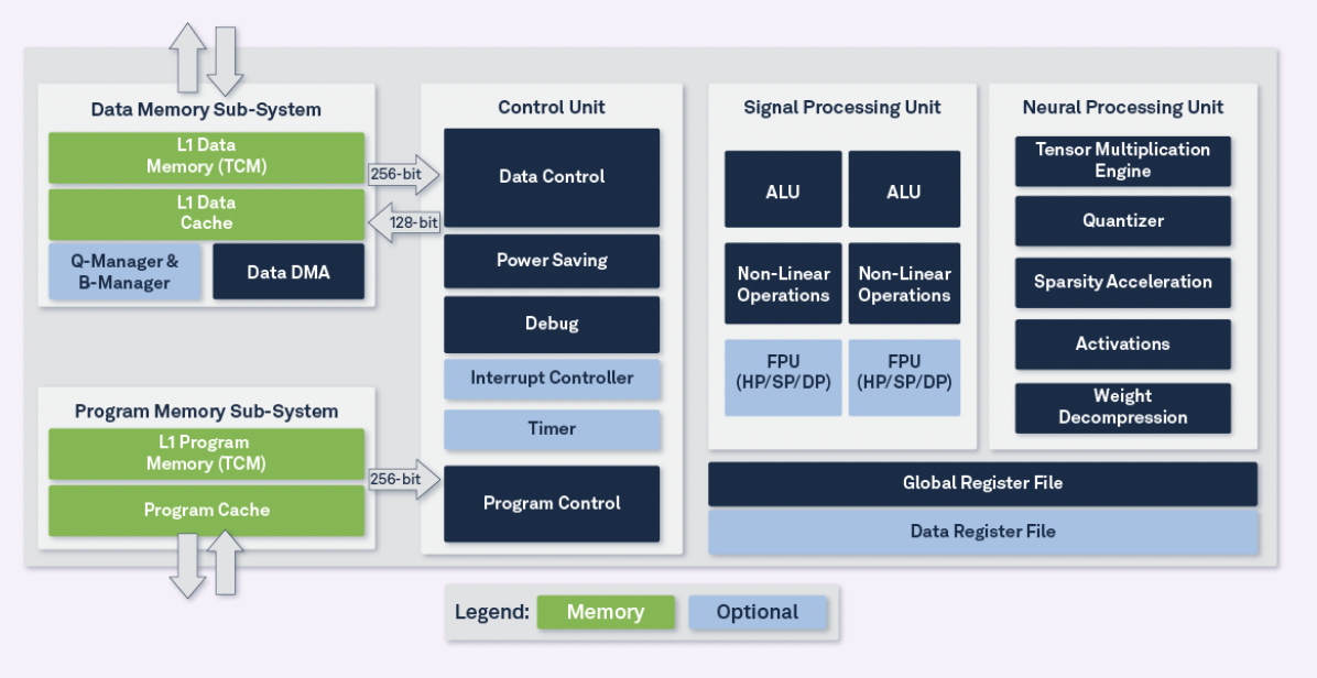 Dans le cadre de la collaboration avec Ceva, l'instance ModelNova ciblée pour les technologies de la société hébergera une sélection de modèles des deux entreprises, autorisant un prototypage et un déploiement rapides de fonctionnalités d'IA dans les objets connectés, les appareils auditifs, les dispositifs domotiques et autres applications fondées notamment sur la propriété intellectuelle des NPU NeuPro-Nano de Ceva (schéma ci-dessous).