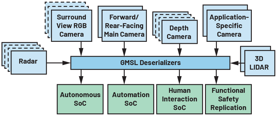 La duplication de flux vidéo et le filtrage de canal virtuel, qui permet d’envoyer une sélection de données vidéo à plusieurs SoC, par exemple pour prendre en charge à la fois les pipelines d’automatisation et d’interaction à partir d’un même flux de caméra, ou de prendre en charge des chemins de traitement redondants pour renforcer la sécurité fonctionnelle.