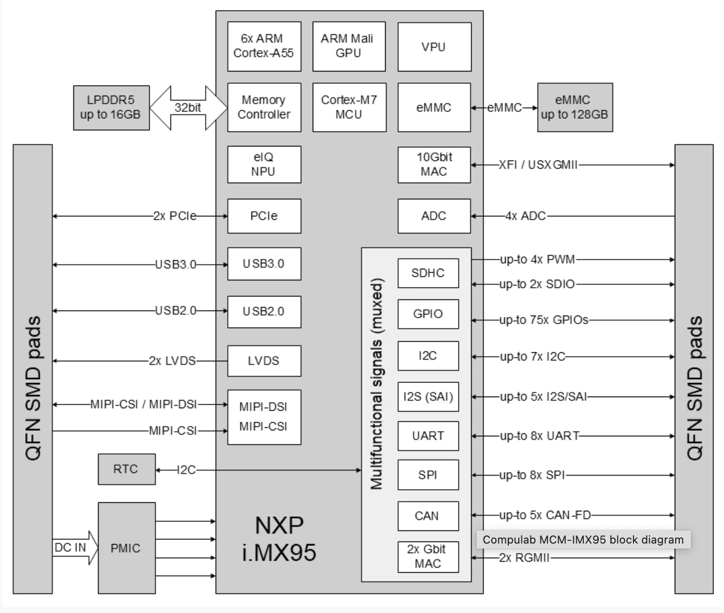 Si il existe à l'heure actuelle sur le marché de nombreuses solutions de cartes CoM (Computer On Module) architecturées autour du processeur i.MX 95 de NXP - ADlink avec un module au format Smarc, Variscite avec un modules propriétaires (le DART-MX95) doté d’un connecteurs carte à carte ou encore Toradex avec un connecteur SO-DIMM (modèle Verdin MX95) - l'israélien Compulab innove dans ce domaine en proposant une des premiers module à souder sous la forme d’un boîtier QFN avec pastilles CMS, doté d’un i.MX 95 (circuit référencé MCM-iMX95-C1800HM-D8-N64).