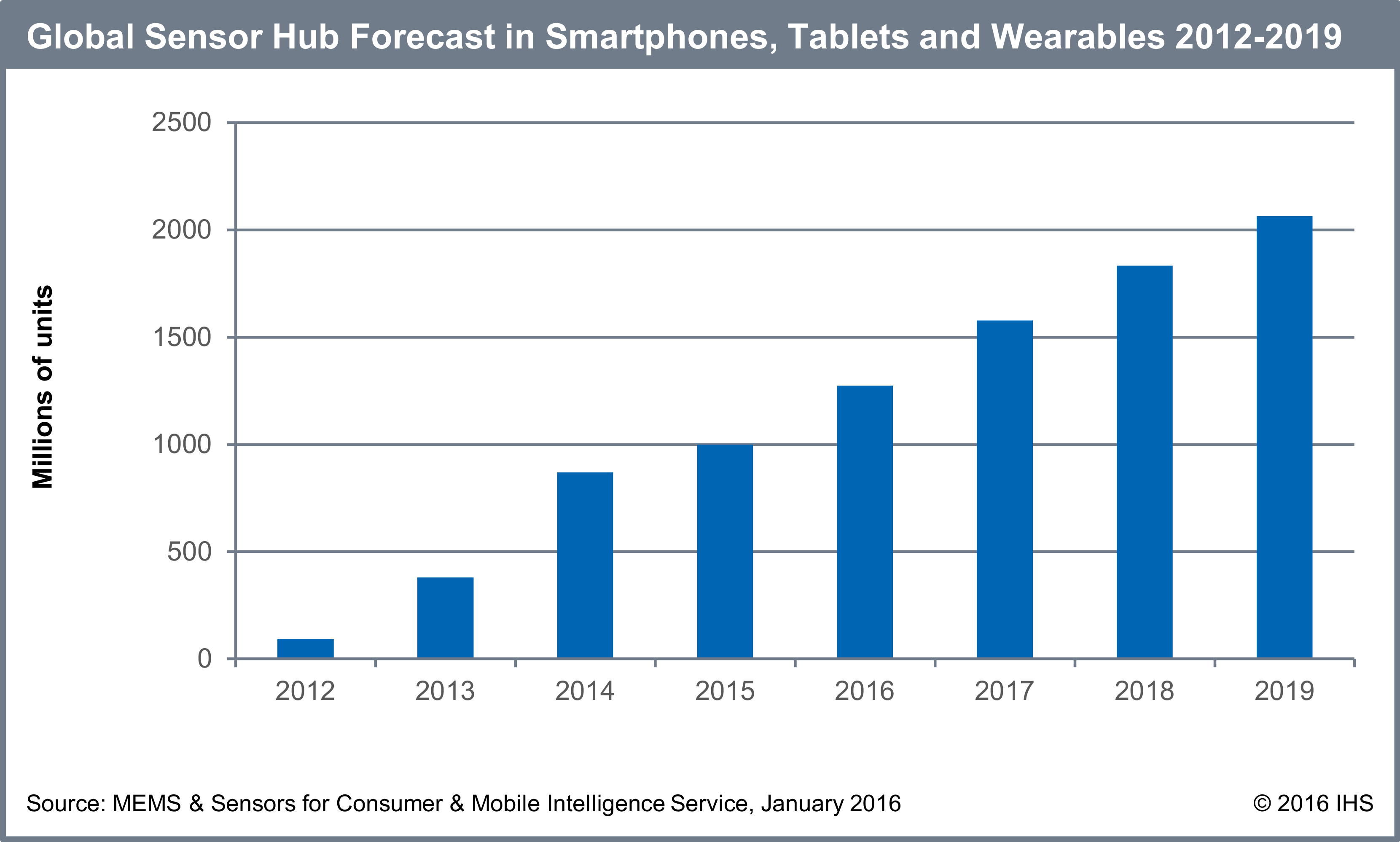 Le marché des « sensor hubs » ou contrôleurs centralisés de capteurs, ces éléments de calcul dédiés chargés d’effectuer des tâches de traitement basse consommation sur les signaux issus de capteurs, explose. ...En raison de l’intégration quasi systématique de fonctions de détection toujours actives dans les smartphones, tablettes et autres dispositifs électroniques portés sur soi (et des contraintes afférentes liées à l’autonomie des batteries), le cabinet d’analystes IHS estime qu’il se vendra près de 2 milliards de sensor hubs en 2018, toutes approches confondues, contre un milliard d’unités en 2015. Samsung, Apple et Motorola en intègrent déjà depuis plusieurs années dans leurs terminaux mobiles et n’hésitent plus à se vanter de l’utilisation de sensor hubs dans des publicités, ajoute la société d’études.
