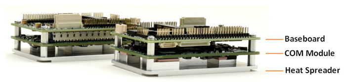 Quant à la partie entrées/sorties, associée à un sous-ensemble d’acquisition de données, au système d’alimentation et à des connecteurs d’extension, elle est gérée par la carte porteuse, disponible en deux versions. Ces deux cartes offrent une sortie écran VGA et un port LVDS monocanal pour l’affichage, deux ports Gigabit Ethernet, quatre ports USB 2.0 et un port USB 3.0, quatre ports RS-232/422/485 programmables par logiciel, 16 lignes d’E/S numériques, un sous-système d'acquisition de données analogiques et numériques et un circuit d'alimentation 6 à 36 V intégré.