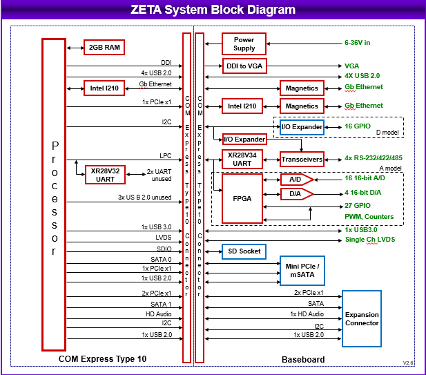 Plus précisément, la famille Zeta s’appuie sur des modules au format COM Express Mini Type 10 (84 x 55 mm) qui assurent la fonction processeur du système, connectés sous une carte porteuse exactement de la même taille avec pour compléter l’ensemble, une plaque en métal vissée pour la dissipation de la chaleur. L’évolutivité du système est assurée via le changement du module COM disponible en trois versions : avec un CPU Intel Bay Trail E3825 à double coeur cadencé à 1,33 GHz et 2 Go de mémoire RAM soudée, avec un Intel Apollo Lake E3940 à quadruple cœur cadencé à 1,6 GHz et 4 Go de RAM soudée, ou avec un Intel Apollo Lake N4200 à quadruple cœur à 1,1 GHz et 8 Go de RAM soudée.