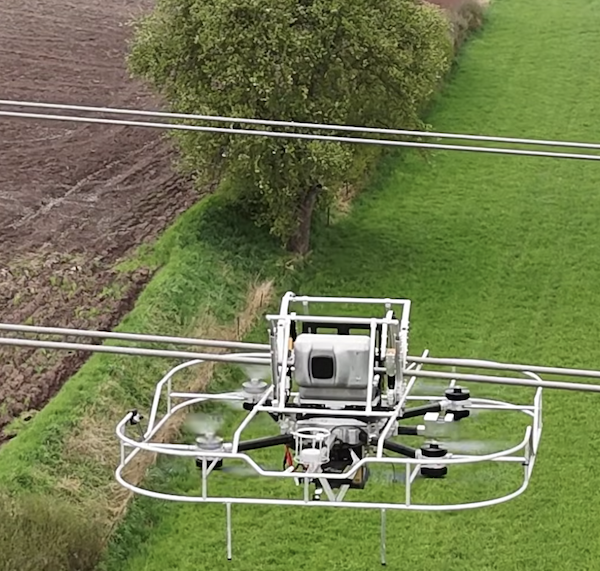 Le drone lui même, d’une envergure de 1,35 mètres pour un poids de 24 kg, est équipé de huit moteurs et peut évoluer sur des lignes à haute tension de 315 000 volts. Protégé par une cage de Faraday, il se pose sur un câble et y progresse grâce à des galets d’entraînement avant de redécoller.